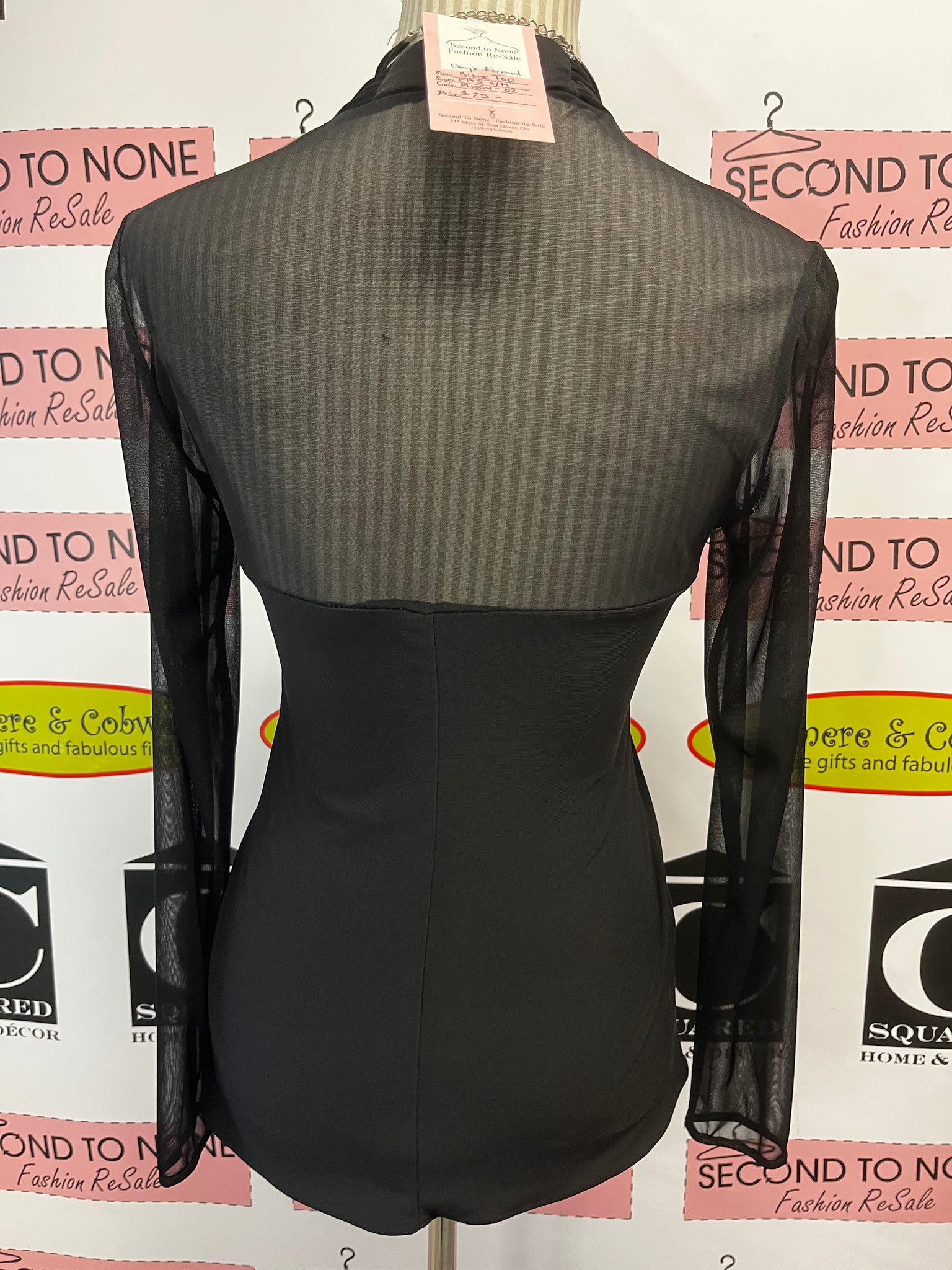 Unleash your daring side with our Onyx Formal Black Top. The sheer long sleeves, upper back and front overlay that gathers down the middle creates a sexy, feminine look. Black sequin trim under the bust adds a touch of girly glam. With a flowy fit and mystical energy, this top is perfect for taking risks and embracing adventure. Size not indicated- fits S/M.