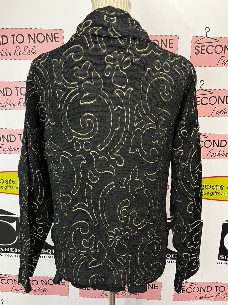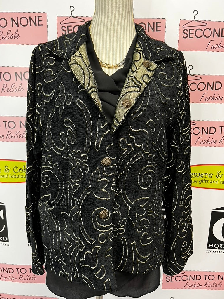 Add some pizzazz to your wardrobe with this reversible, elegant jacket from Parsley & Sage. One side boasts a bold black with gold design, while the other is gold with black details. Perfect for any occasion, this jacket is made with a tapestry like material and features a convenient button up front.