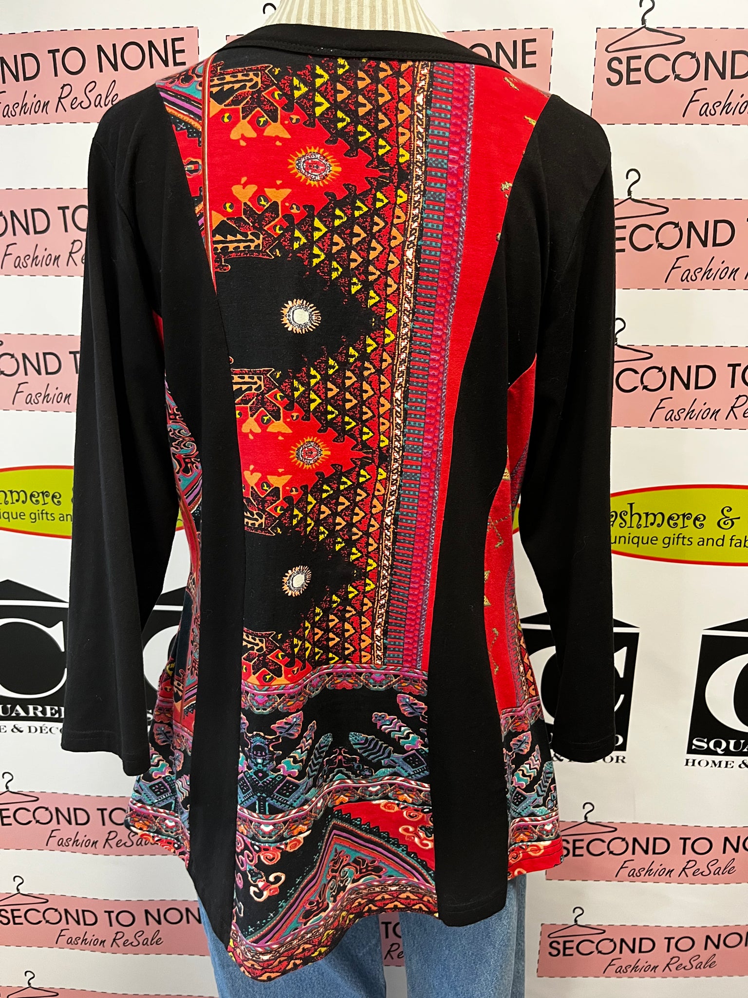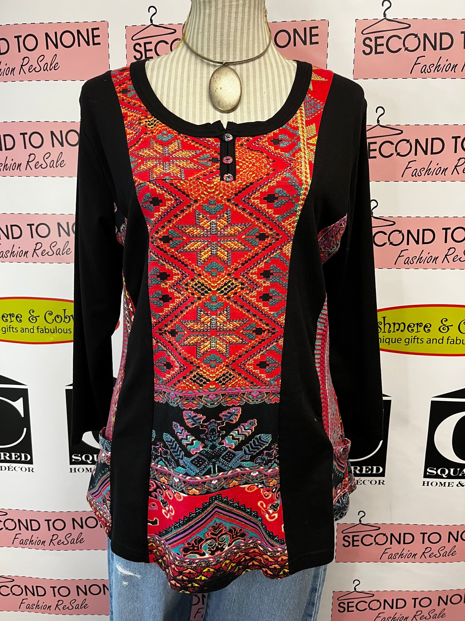 This Parsley & Sage tunic in size M features playful 3/4 sleeves and a relaxed tunic length, perfect for layering or wearing solo. The black cotton blend fabric is brightened with colourful print accents, adding a splash of fun to your day. Button details on the neckline add a charming touch to this easygoing, versatile piece.