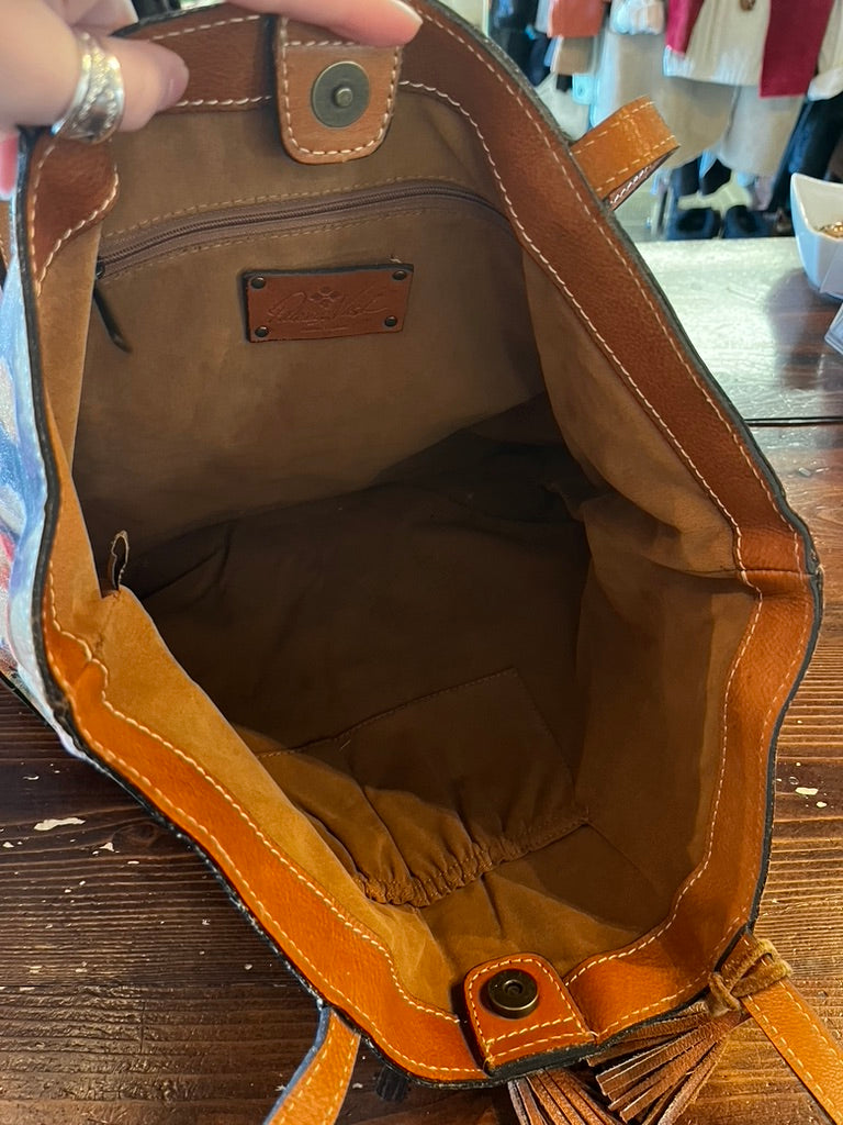 This charming Patricia Nash shoulder bag blends genuine Italian brown leather with whimsical floral printed panels, adding a splash of fun to your everyday style. Spacious enough to hold all your essentials, it’s perfect for those who love combining practicality with playful elegance. Whether on a casual outing or a lively day in town, this purse is your delightful companion.