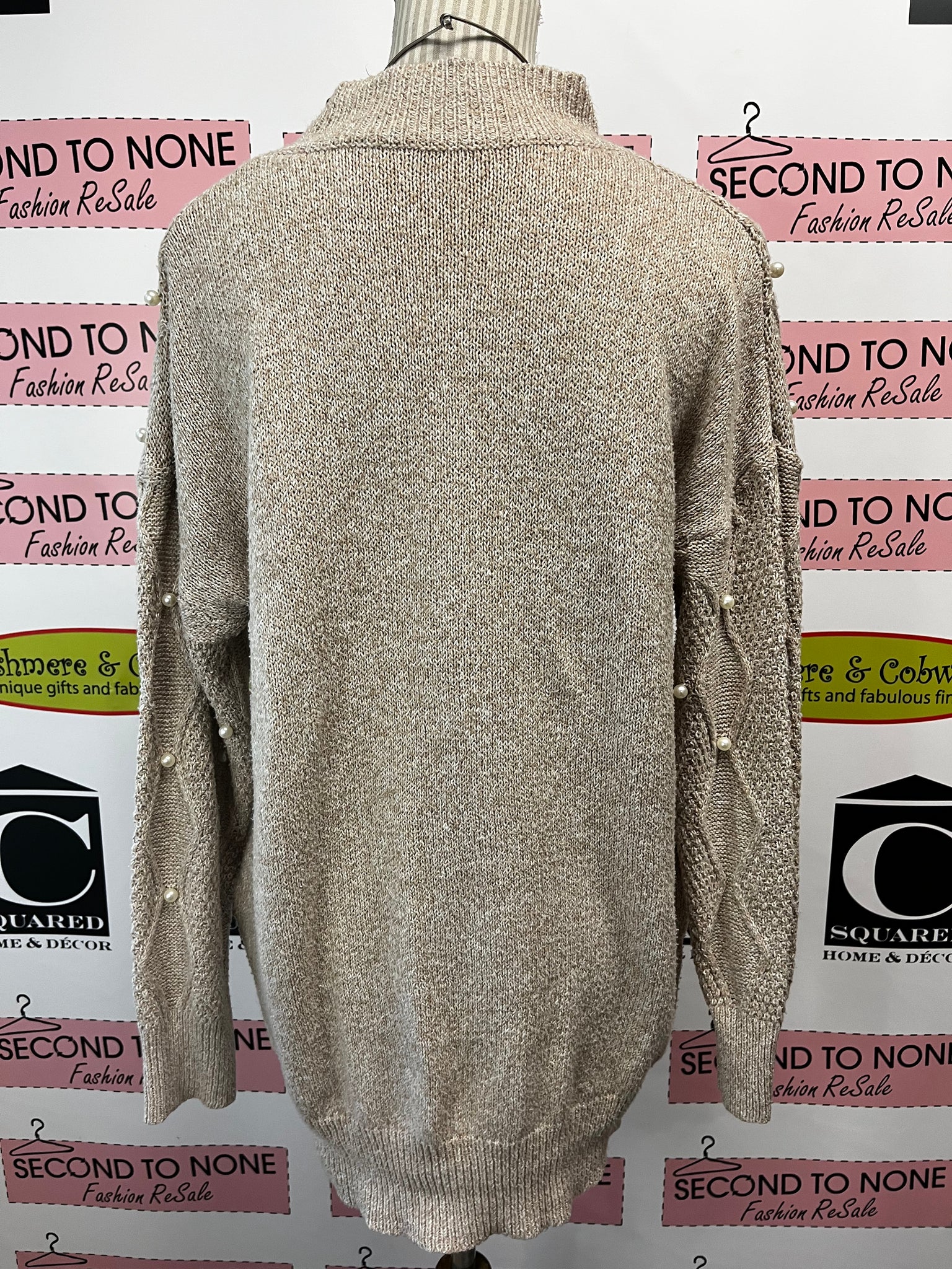 Wrap yourself in cozy charm with this lightweight beige knit sweater, adorned with delicate pearl details that add just the right touch of sparkle. Perfect for crisp fall days, it keeps you comfy without weighing you down—because who says you can't be snug and stylish at the same time? Size not indicated but fits like a L.