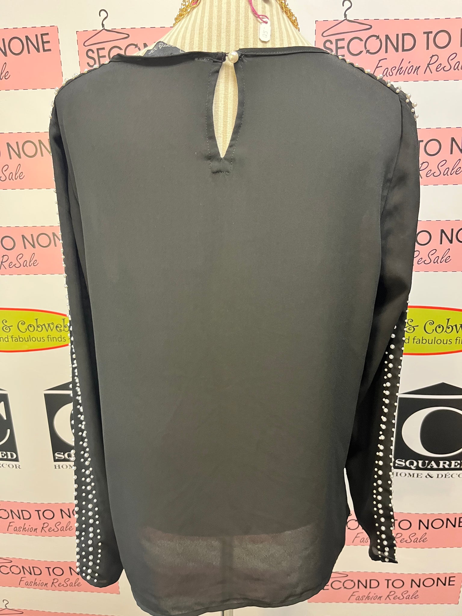 Elevate your style with this Pearl Sleeve Blouse, where classic meets unexpected charm. The standout feature? Sleeves lined with seven rows of delicate pearls, adding a playful twist to your everyday black blouse. Whether you’re aiming for edgy or sophisticated, this blouse effortlessly adapts to your mood and occasion. Perfect for turning heads with a subtle sparkle! Carre Noir brand. 100% polyester