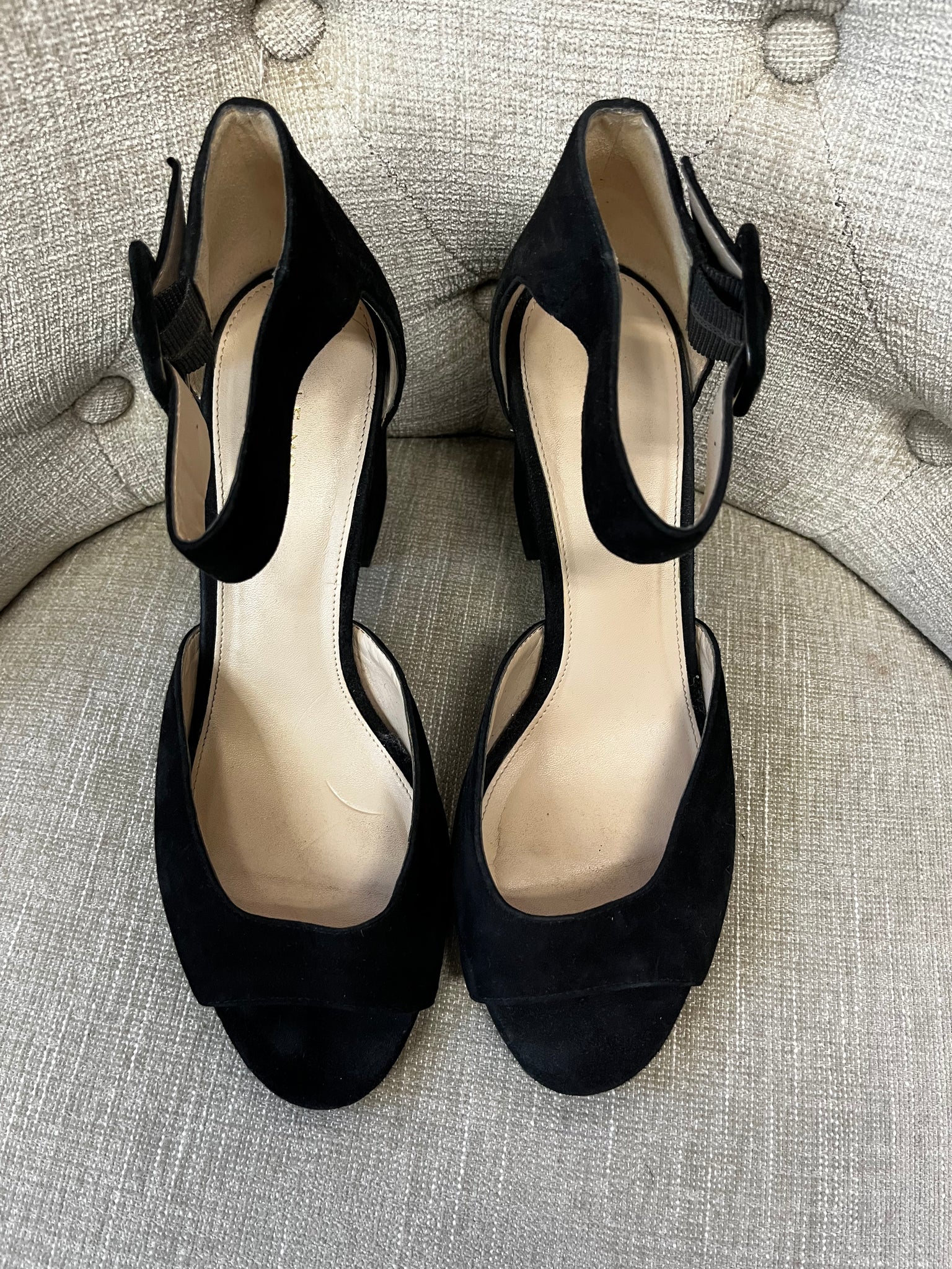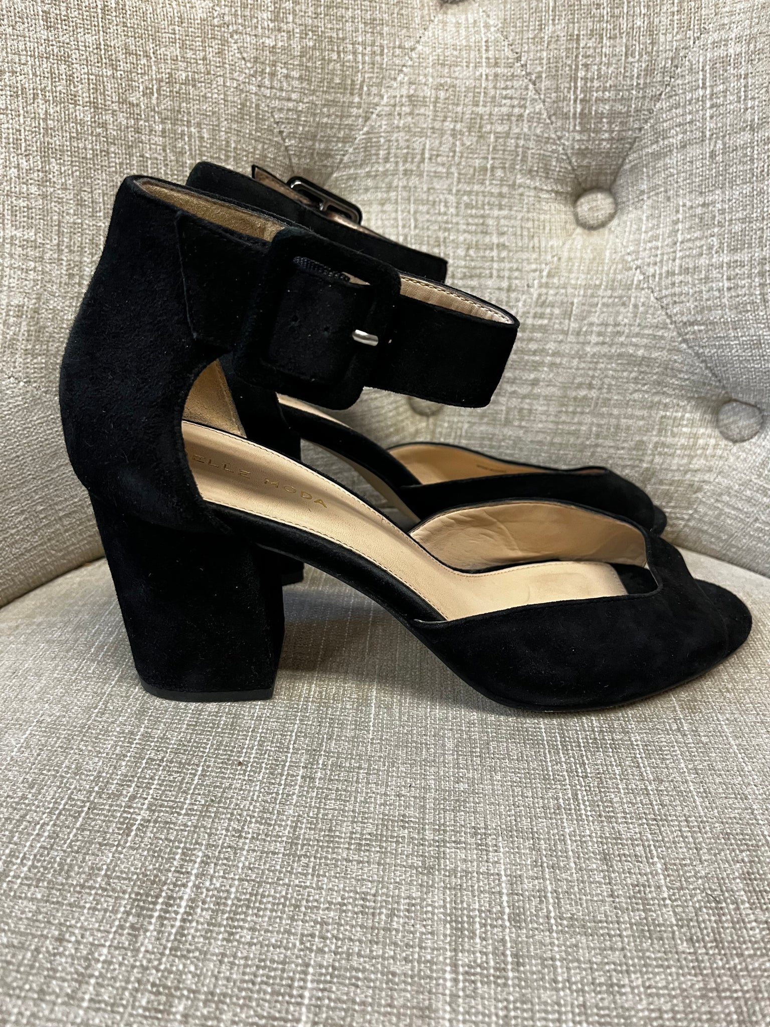 Step into style and comfort with these black faux suede chunky heels by Pelle Moda. Featuring a playful open-toed design and a sturdy 3-inch block heel, they offer perfect balance for dancing the night away. The ankle strap adds a flirty touch while keeping your feet secure. Ideal for adding a chic edge to any outfit, these size 9 heels combine fun and function effortlessly.