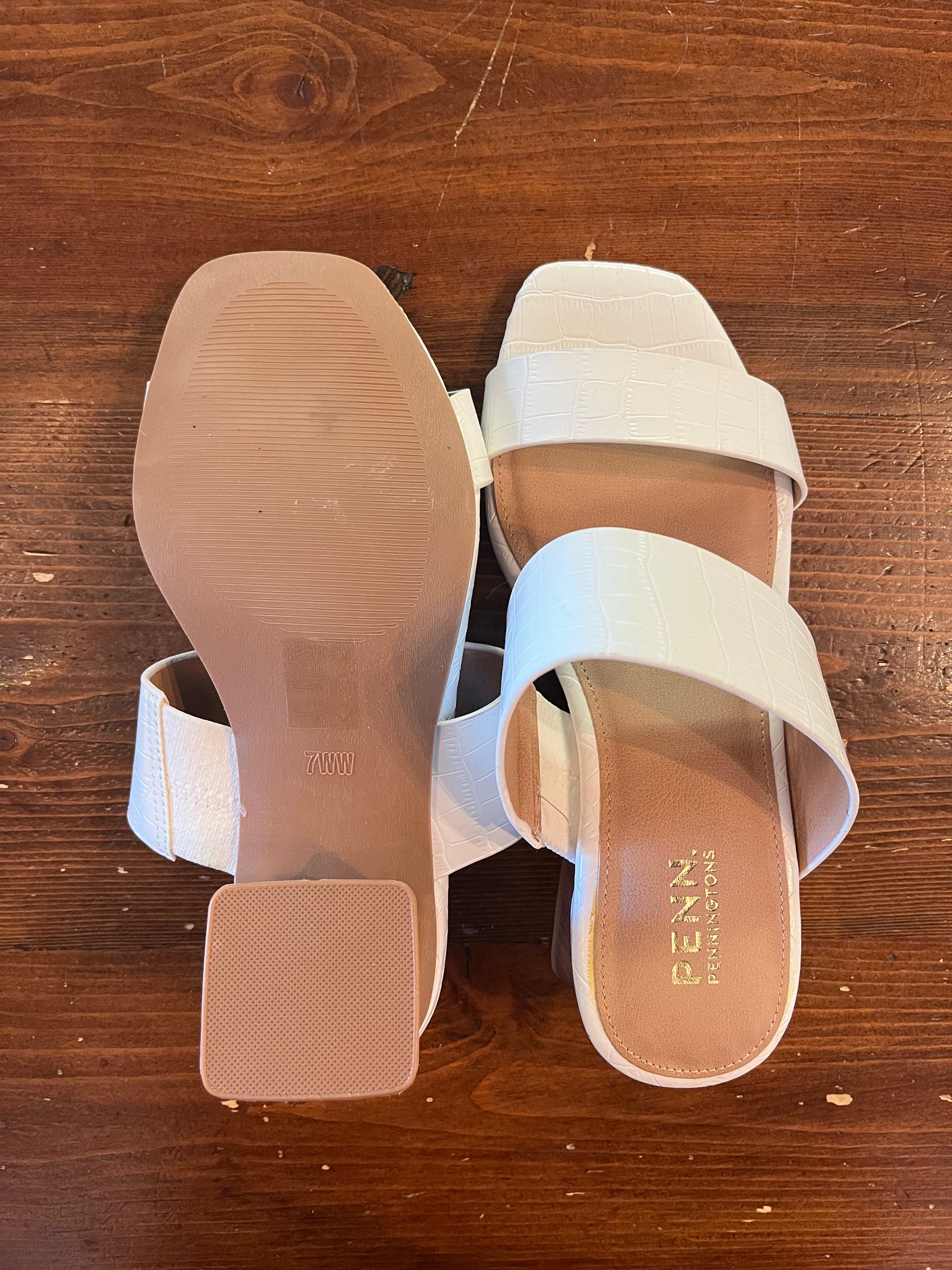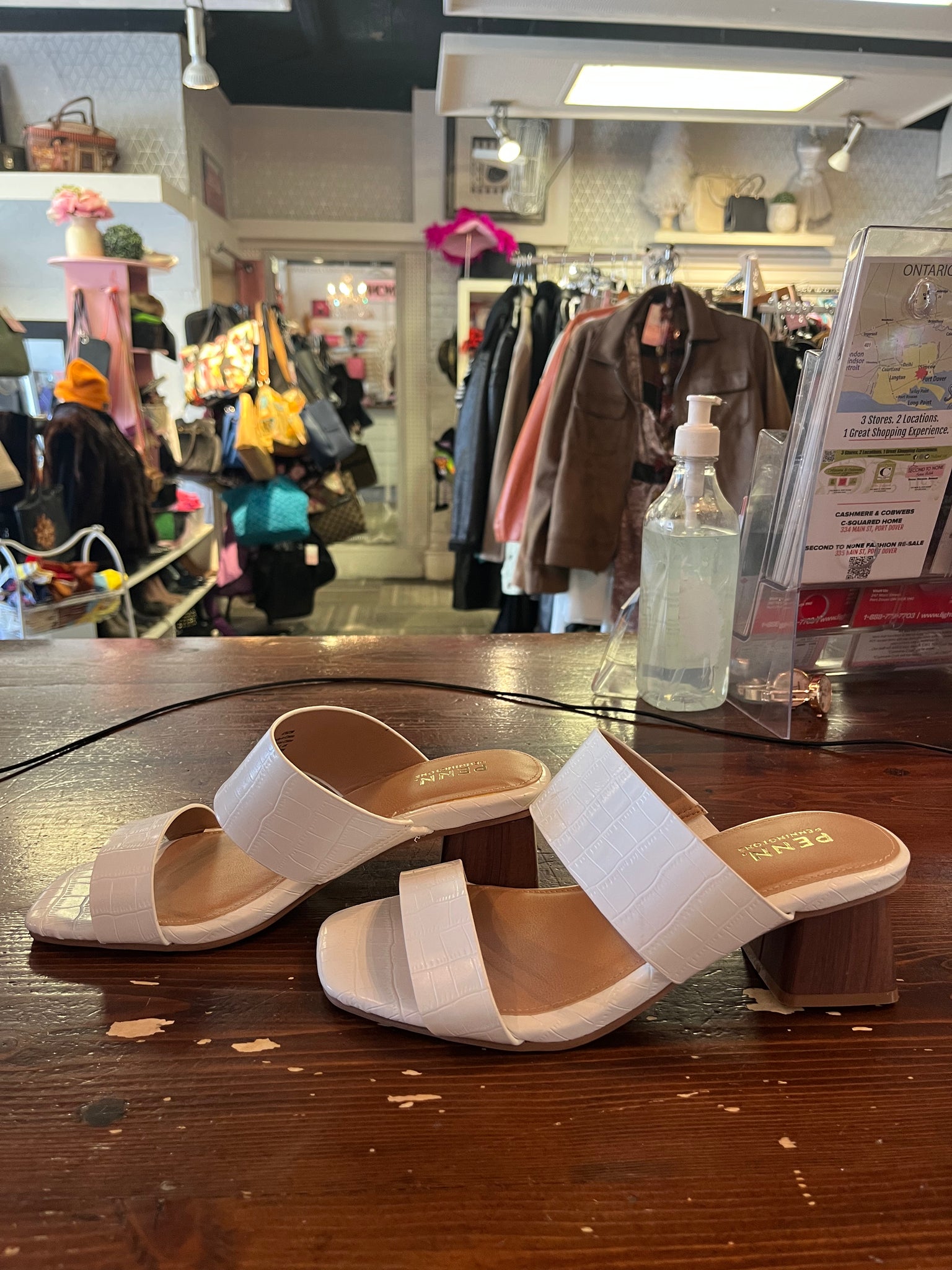 Elevate your style with Pennington's White Heeled Sandals. Featuring a 1.75 inch block heel with a wooden look, these sandals provide both height and comfort. The square toe, double strap design and subtle animal printed leather add a touch of femininity to these classic and chic sandals. A cushioned heel ensures maximum comfort, making these perfect for any occasion. Available in a bright white colour and wide fit, these sandals are the epitome of elegance. In excellent condition for the perfect finishing touch to any outfit. Size 7.