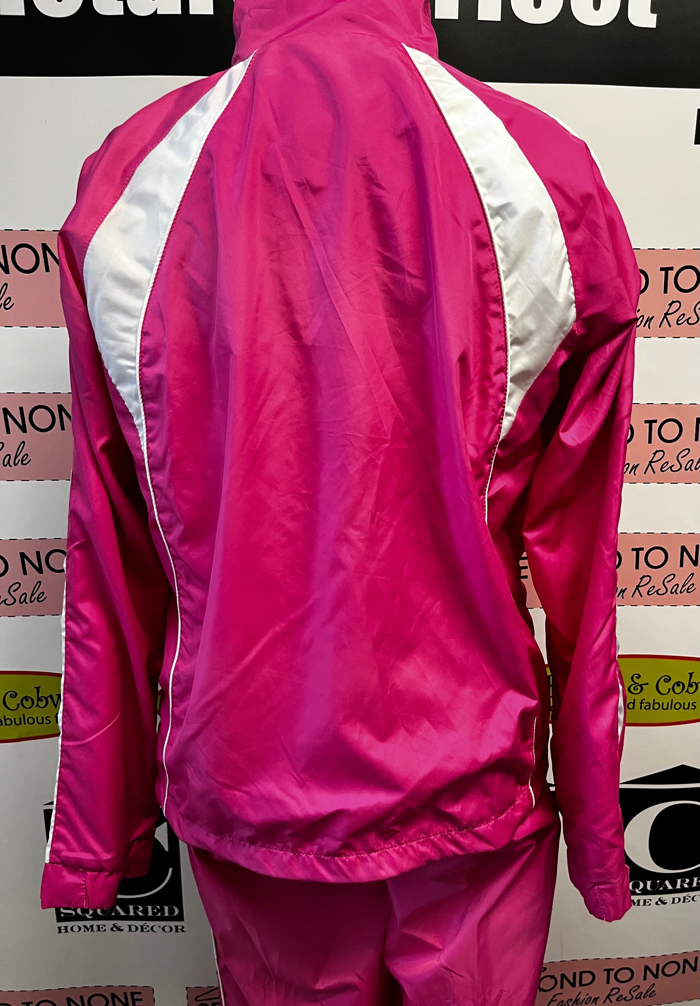 Be bold in pink while supporting a good cause with our Pink & White Tracksuit! Made by MyPink, this sporty set features a zip up jacket and pants in bright pink windbreaker material. Plus, the breast cancer awareness ribbon adds a touch of meaning to your athletic look.