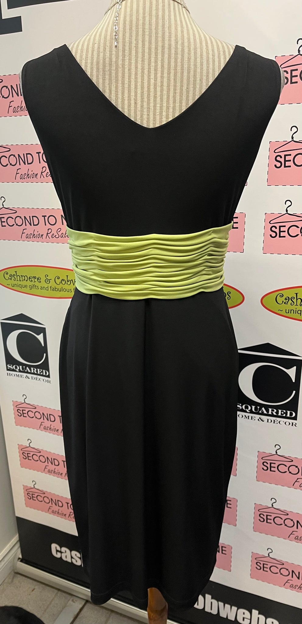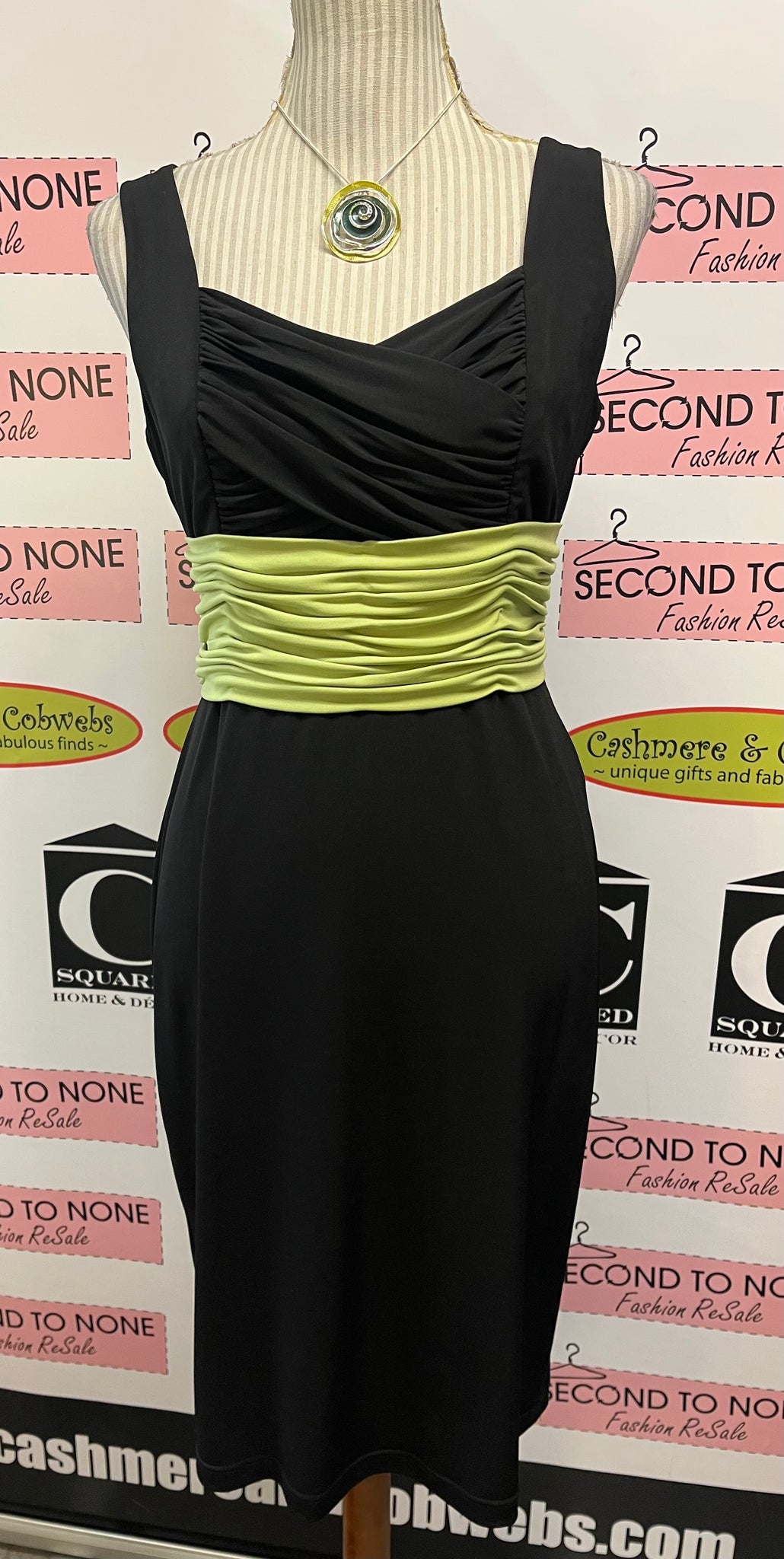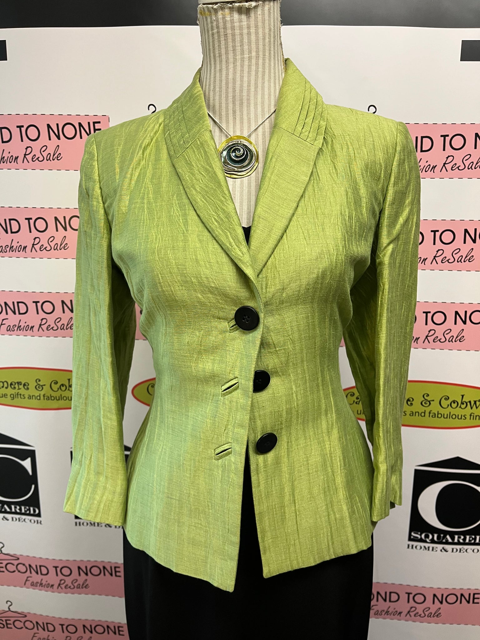 Step out in style with this chic Précis Petite dress and jacket set. The classic little black dress features a vibrant ruched lime green waistband that perfectly complements the matching green blazer. A pleated neckline and triple-button front add charming details that make this outfit truly stand out. Perfect for making a playful yet polished statement at any event. Sized to fit perfectly at size 10, this set brings a fresh twist to timeless elegance.