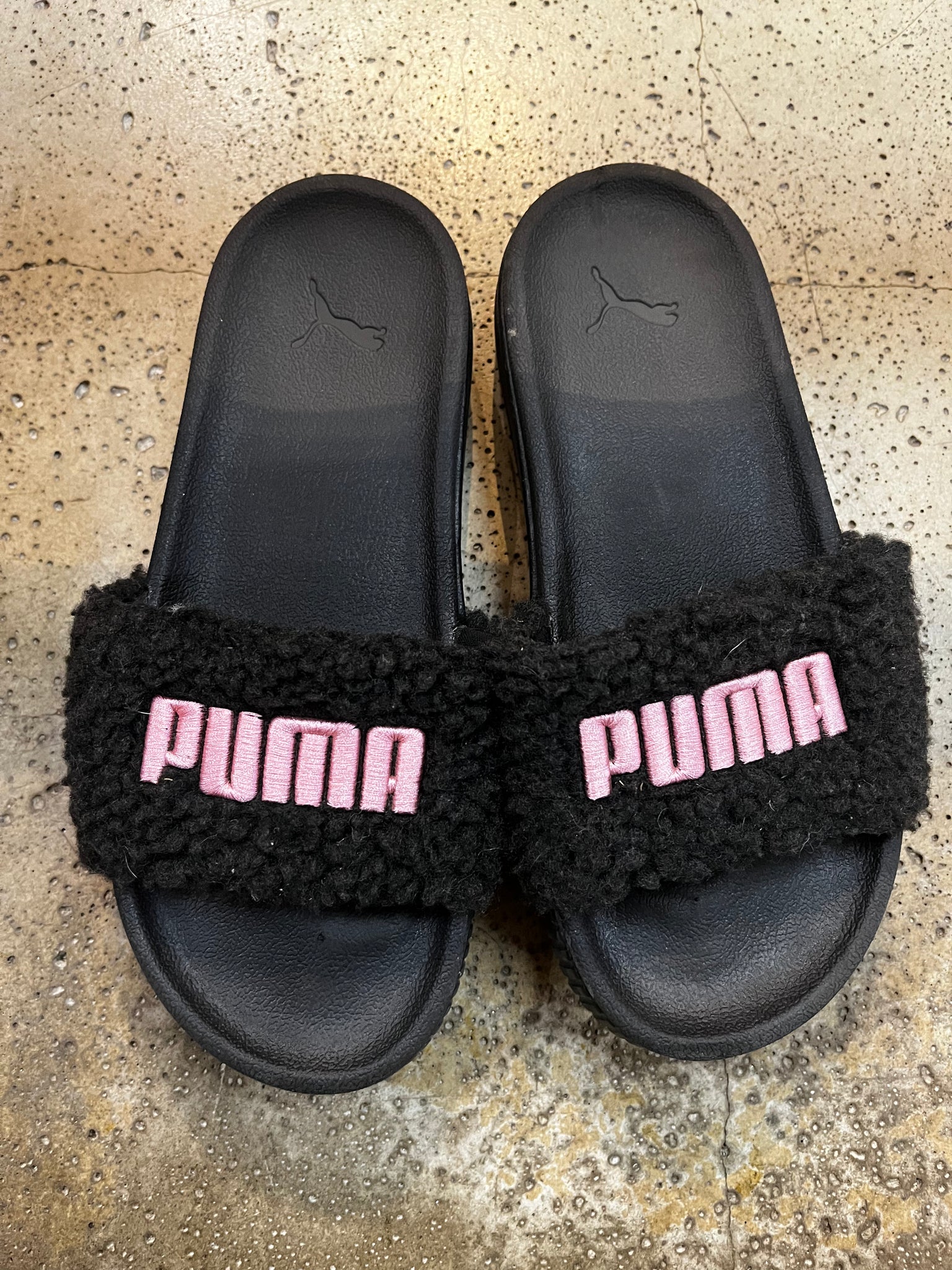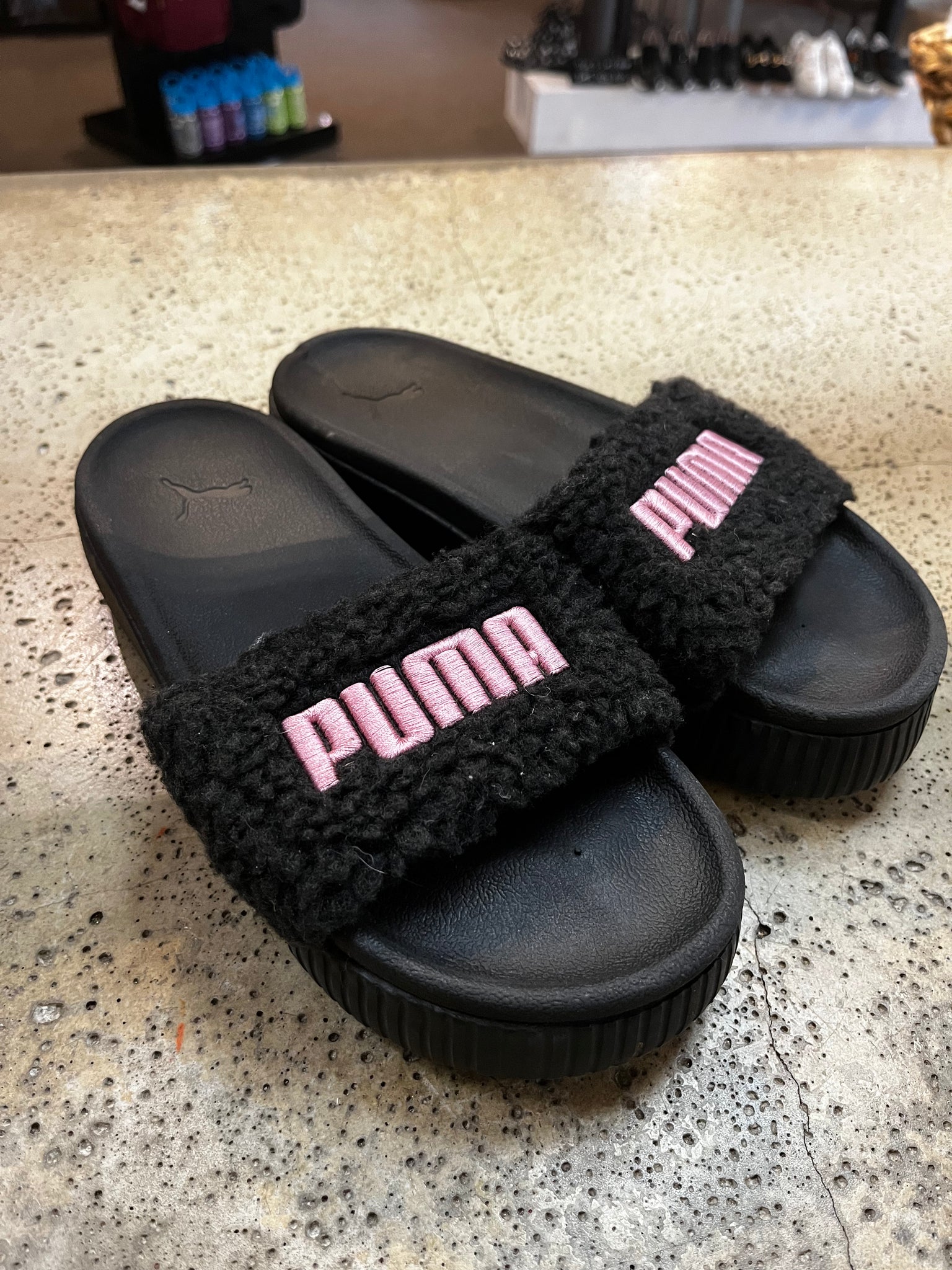 Looking for a touch of fun and comfort in your footwear? Look no further than these Puma Platform Sherpa Slides. These black slip-on sandals feature a cozy black sherpa band and a 2-inch platform for added style. With Puma written in playful pink, these slides are a must-have for your collection.