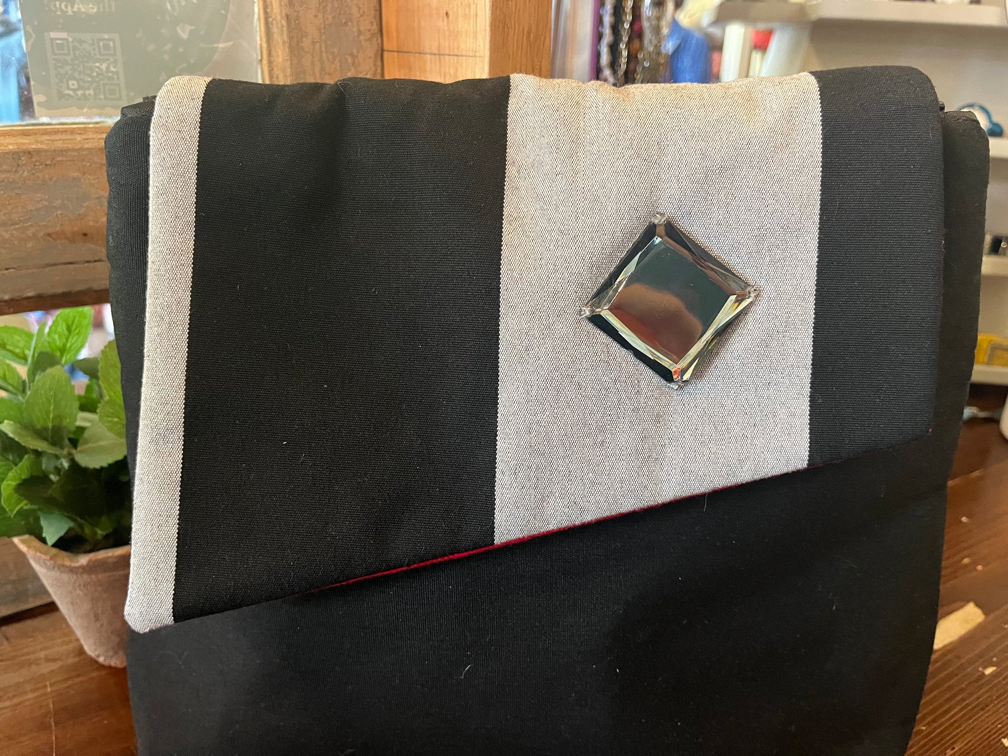 Expertly crafted and designed with a unique flair, our Quilted Fabric Bag by Oops boasts a large chain shoulder strap, velcro closure, and zippered opening for ultimate safety and convenience. The black canvas fabric and red quilted interior add a striking contrast, while the large gemstone on the front makes a statement sure to turn heads.