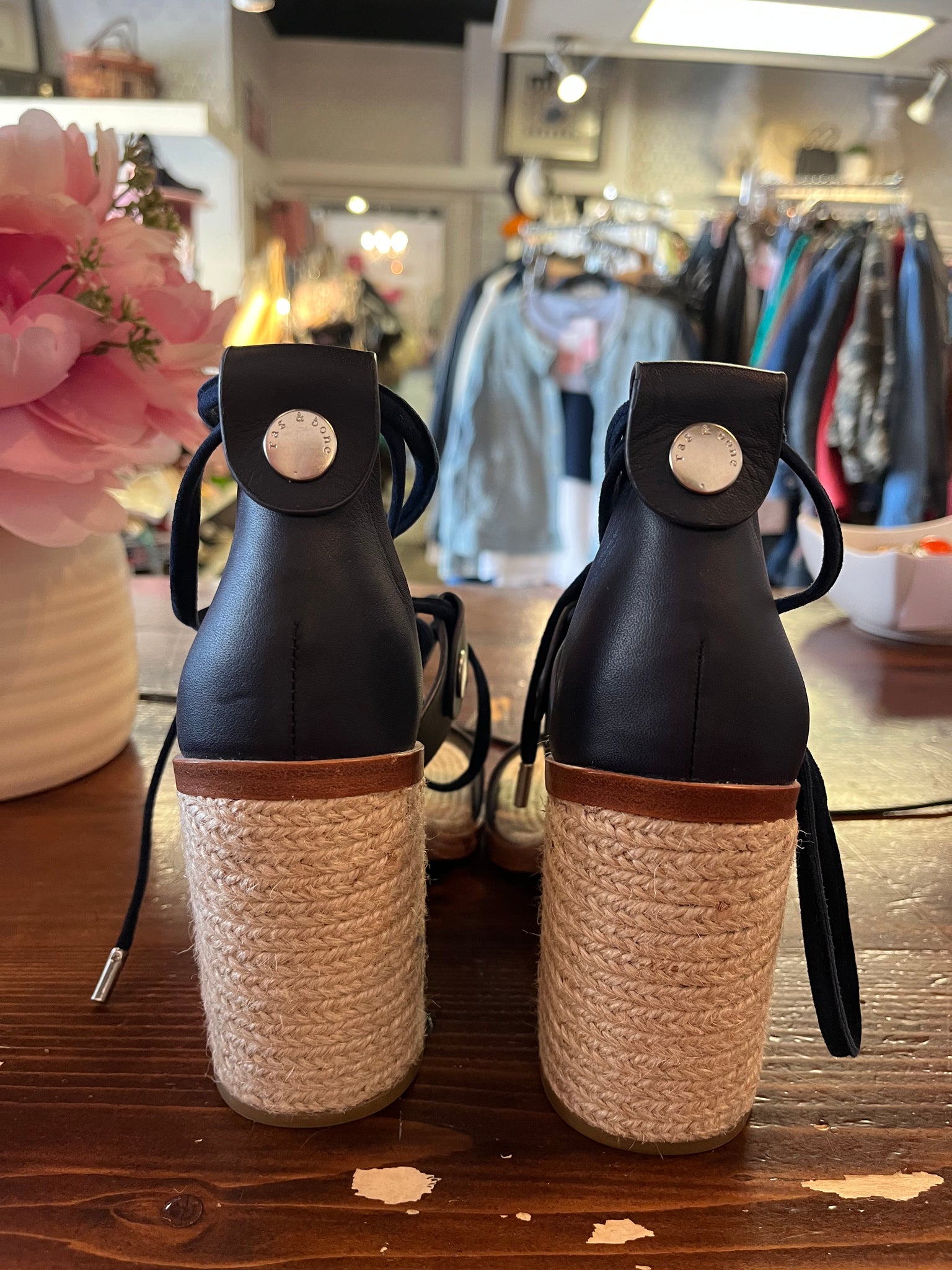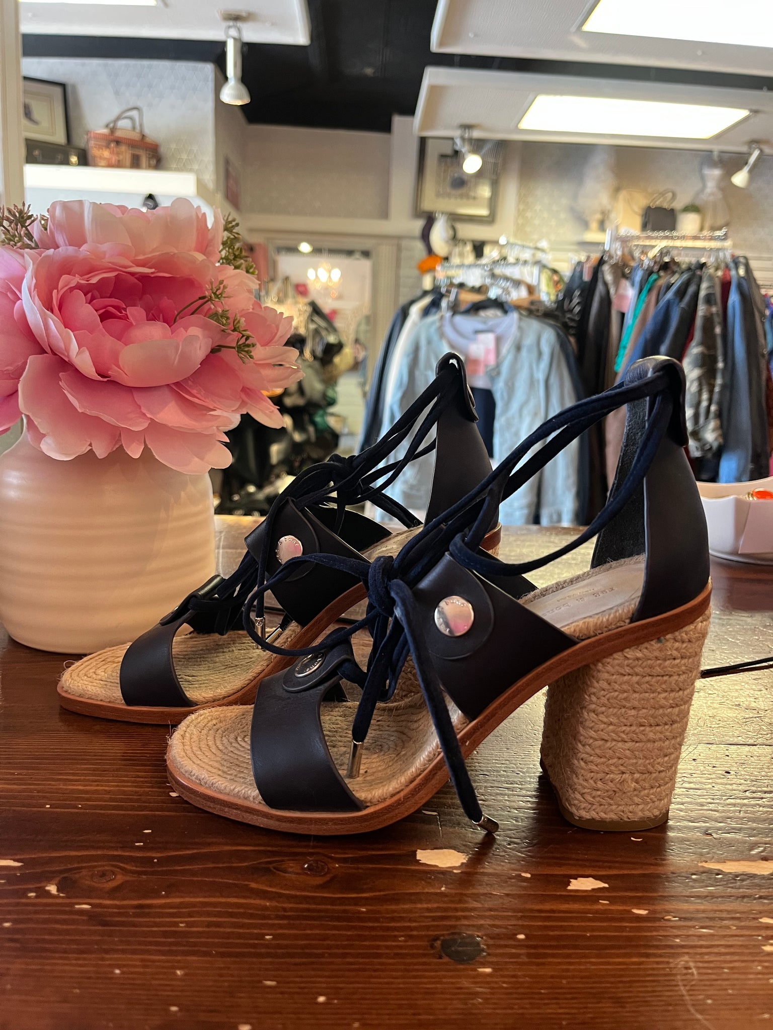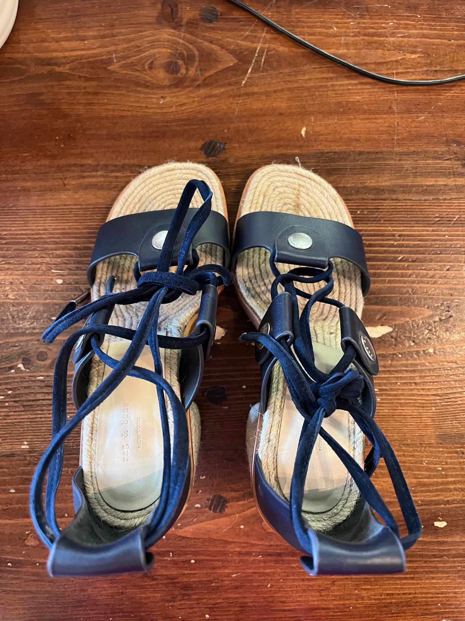 Indulge in luxury and sophistication with our Rag and Bone Eden Lace Up Sandals in navy blue leather. Adorned with silver hardware and a 4 inch jute block heel, these sandals will effortlessly elevate any outfit. The softly squared open toe and adjustable ankle ties provide a perfect fit. Complete with a jute toe pad that will peek out while you’re wearing them, these timeless sandals are perfect for warm weather. Retails for almost $700 and in great condition. Size 36.5 = 6.
