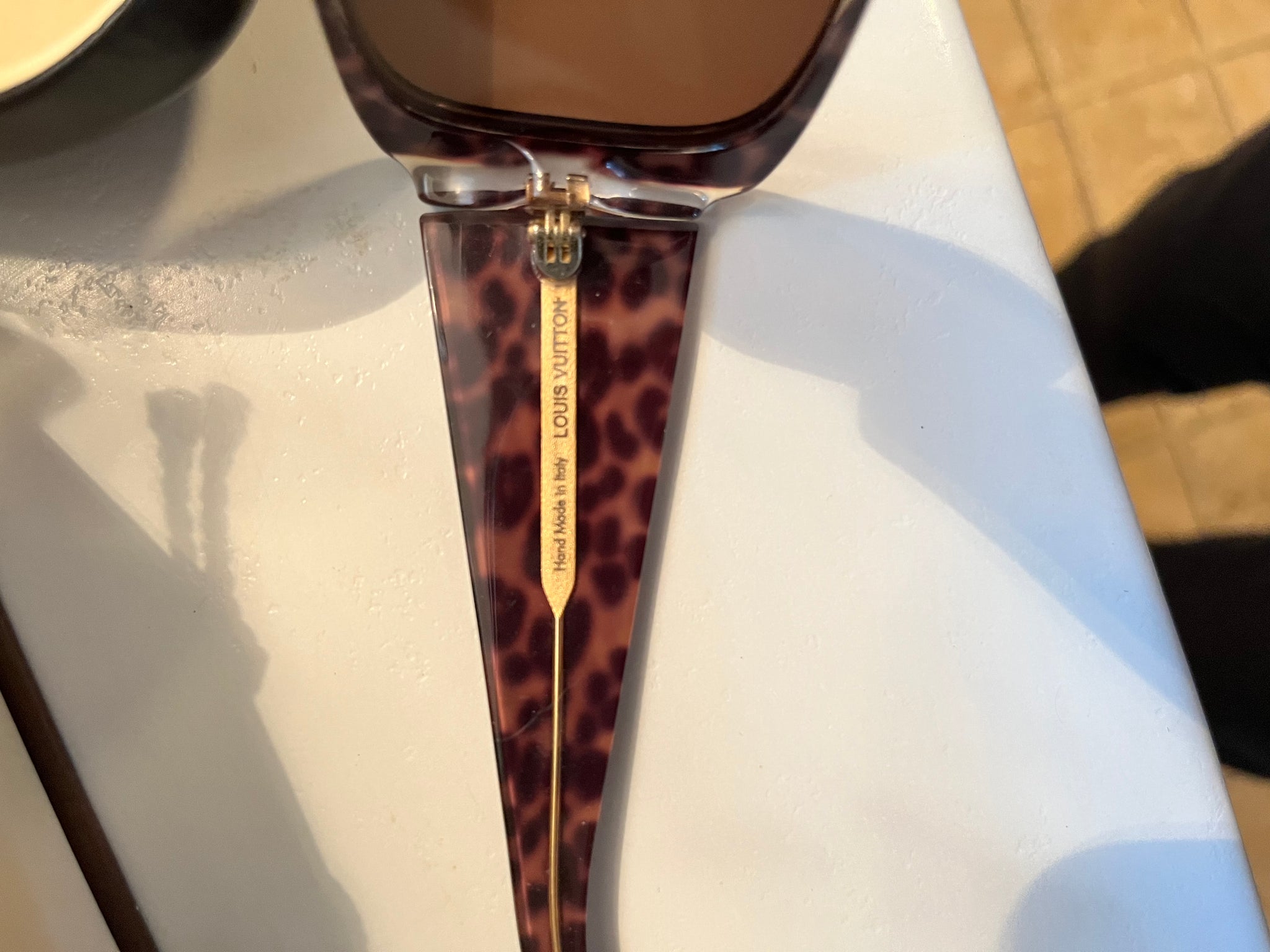 Get ready to elevate your style with these REAL LV Sunglasses! These dark brown with leopard arms...designer shades are the real deal and guarantee to make a statement. Complete with a box, case, and cloth sleeve, these Louis Vuitton sunglasses also come with a unique serial number inside. Step out with confidence and stand out from the crowd with these luxurious shades. NOTE: They could be tightened slightly for the perfect fit.