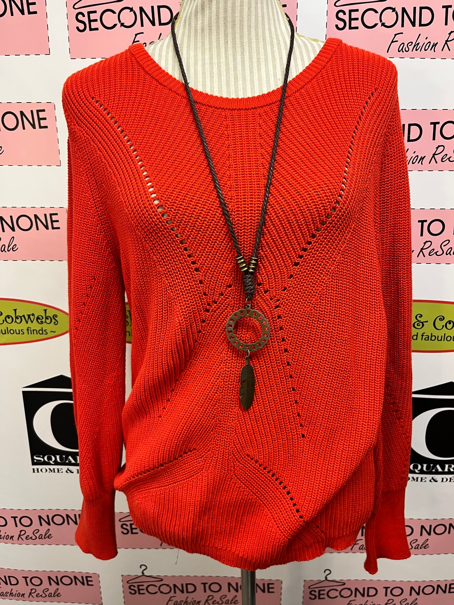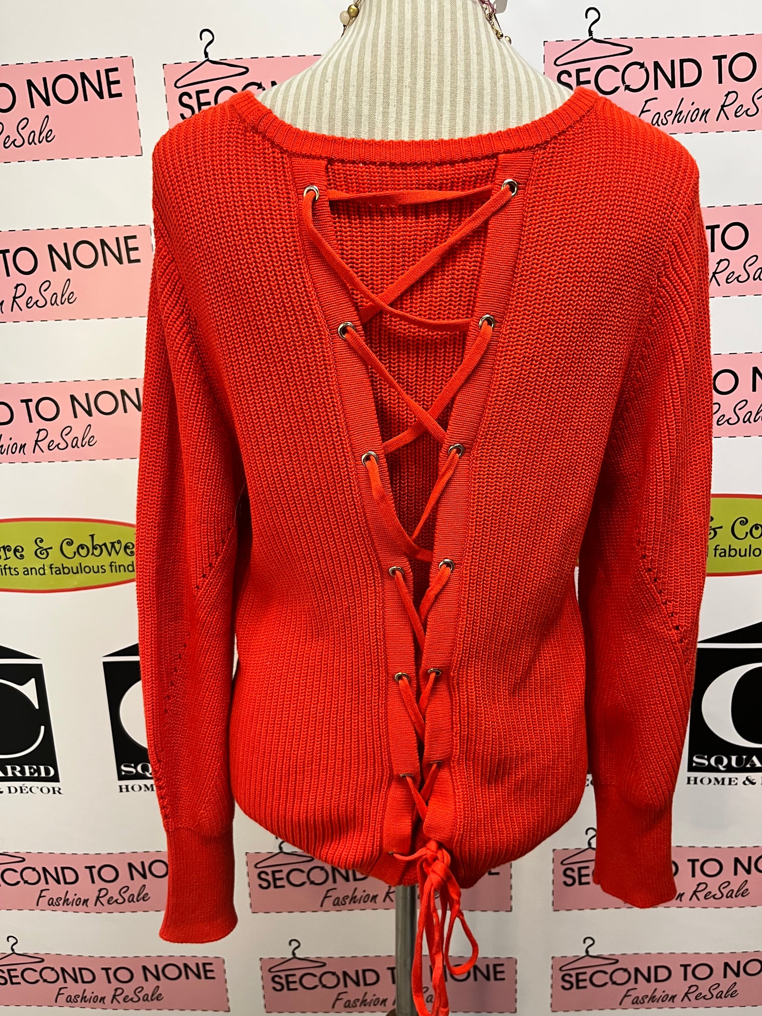 This Vince Camuto red cotton sweater features charming stitch details that add a fun twist to your look. The standout corset-style back with grommets and a shoe-string rope tie-up lets you adjust the fit while turning heads. Perfect for adding a playful edge to your everyday style! 100% cotton.