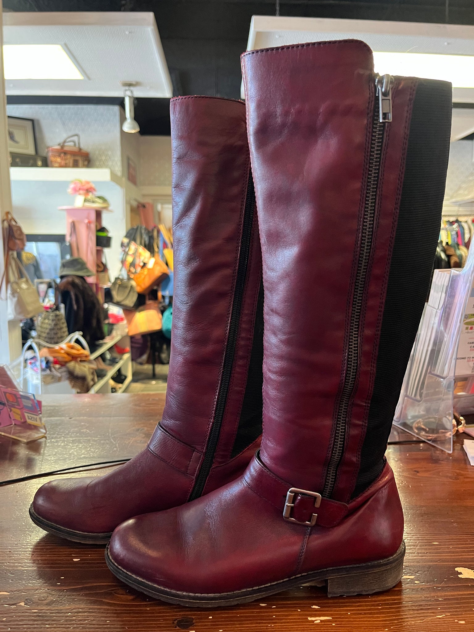 These stylish boots feature a deep wine red leather that will add a pop of colour to any outfit. The round toe and grippy sole provide both comfort and stability. The 1 inch heel gives a slight lift while the silver buckle adds a touch of classic style. With a stretchy black fabric on the posterior sides, these boots are both fashionable and functional. Perfect for the upcoming fall months. Size 7. Brand: Remonte.