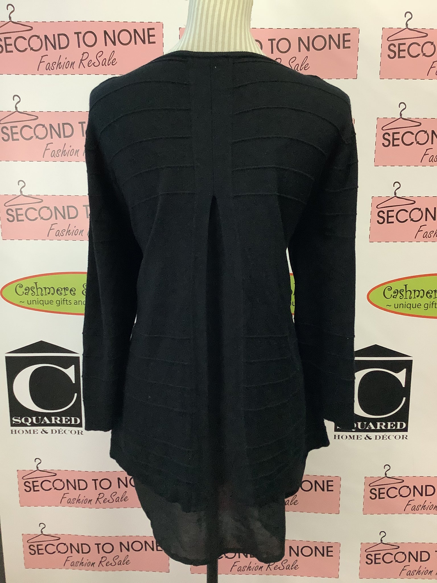 This Renuar Black Tunic (Size L) is a great addition to your wardrobe. Crafted from a ribbed texture, it features a simple scoop neck and long sleeves with ribbed cuffs. Easily elevate your look by pairing with big jewellery. Perfect for casual and formal styling. Completed with a sheer black fabric along the hemline and underneath to cover the slit in the back