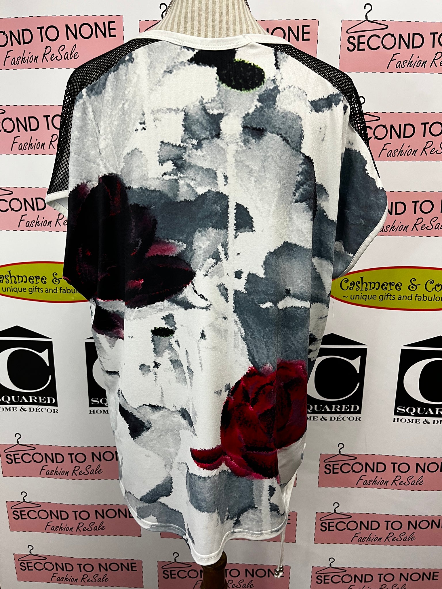 Make a statement with this Flowers Printed T-Shirt! A playful mix of big printed flowers and blue splotches create a fun and quirky painted appearance. The black mesh panel across the shoulders adds a unique touch, and ruching with drawstrings on one side offers an adjustable fit. Slightly sheer, this is the perfect all year round shirt. Add some quirkiness to your wardrobe! Brand: Variations. Size XXL.