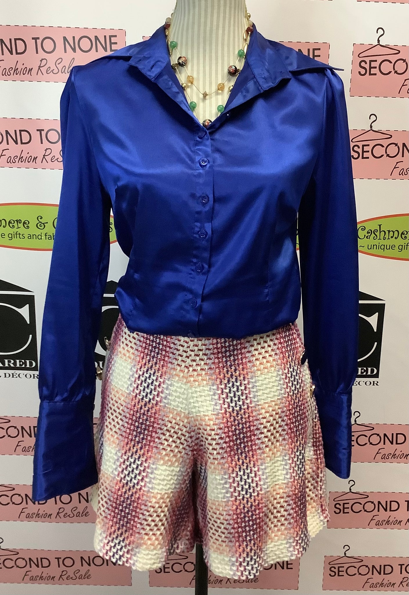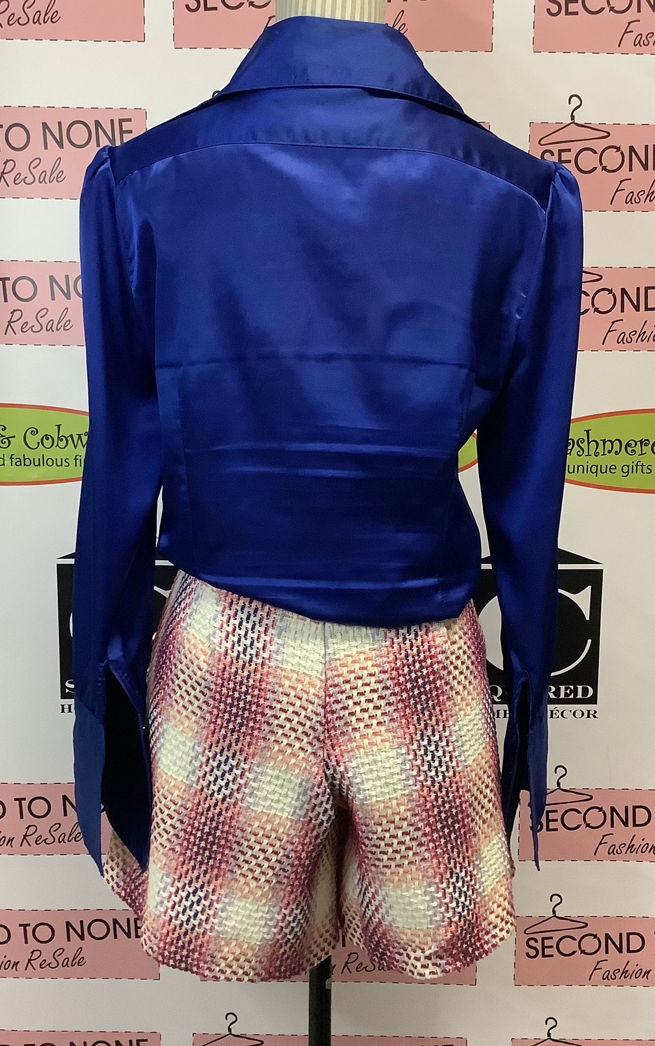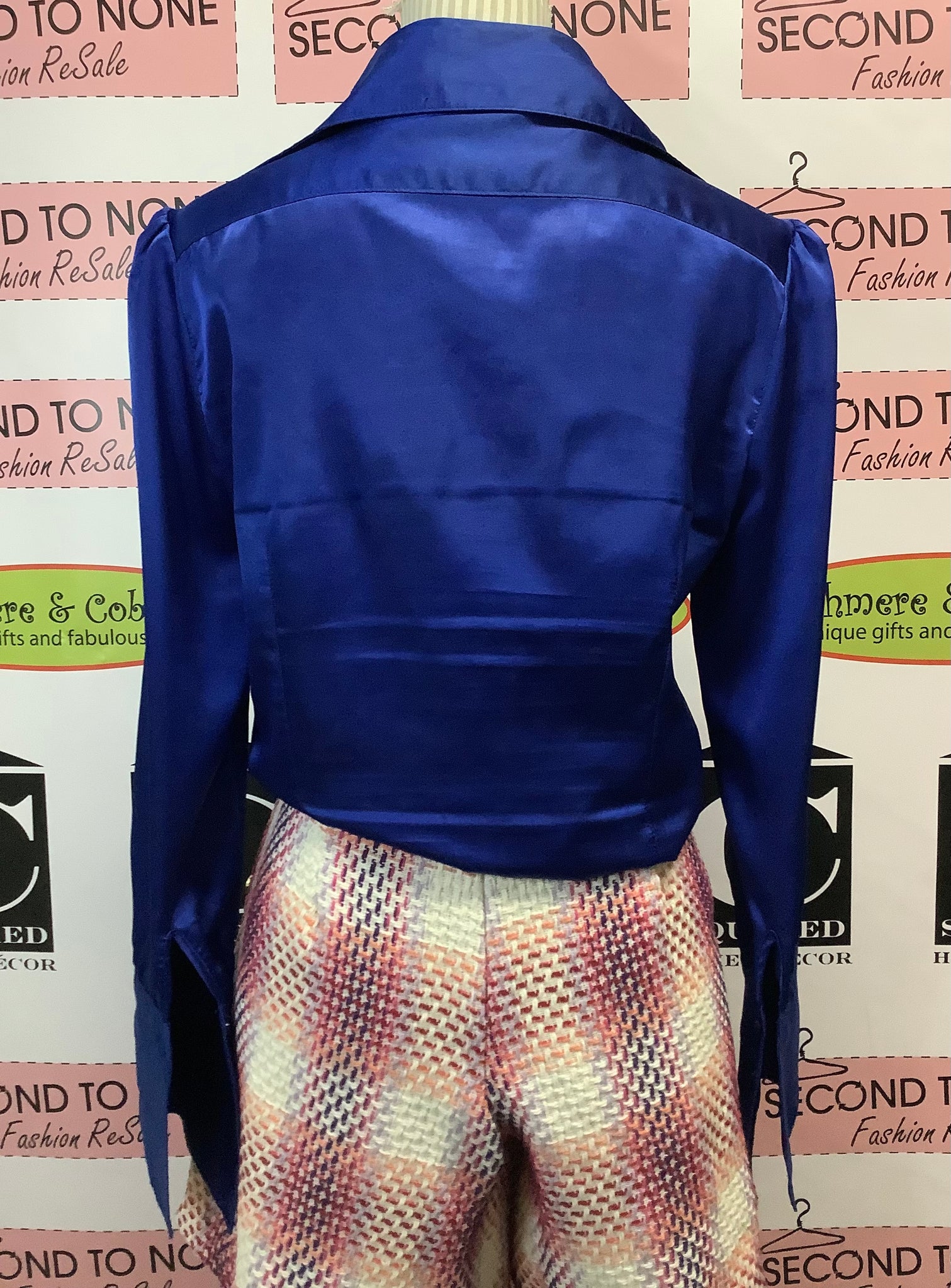Indulge in luxurious style with our Royally Rockin' Blouse. The brilliant blue hue exudes sophistication while the over-sized cuffs and collar add a bold touch. The shiny fabric and button closure elevate this piece to a true work of art.