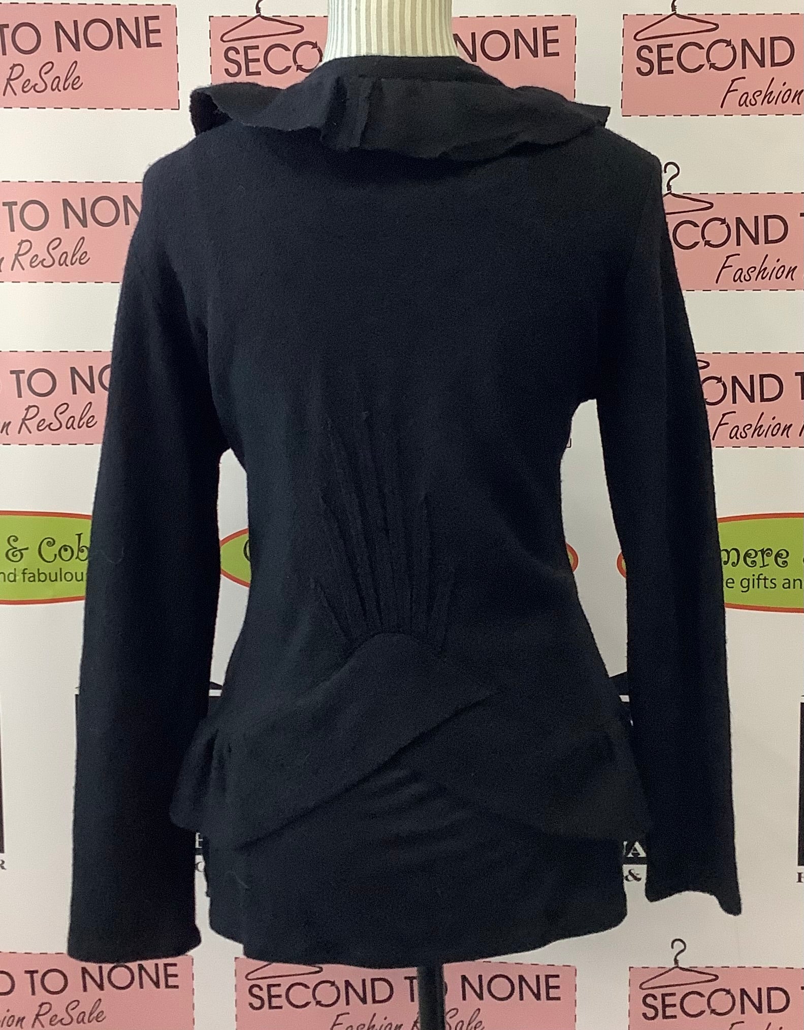 Look stylish with this black wool blend blazer. Structured with intricate layered ruffles and a rounded hemline, this blazer is secured with a dual hook and eye closure and long sleeves for a perfect fit. 60% Viscose, 40% Wool.