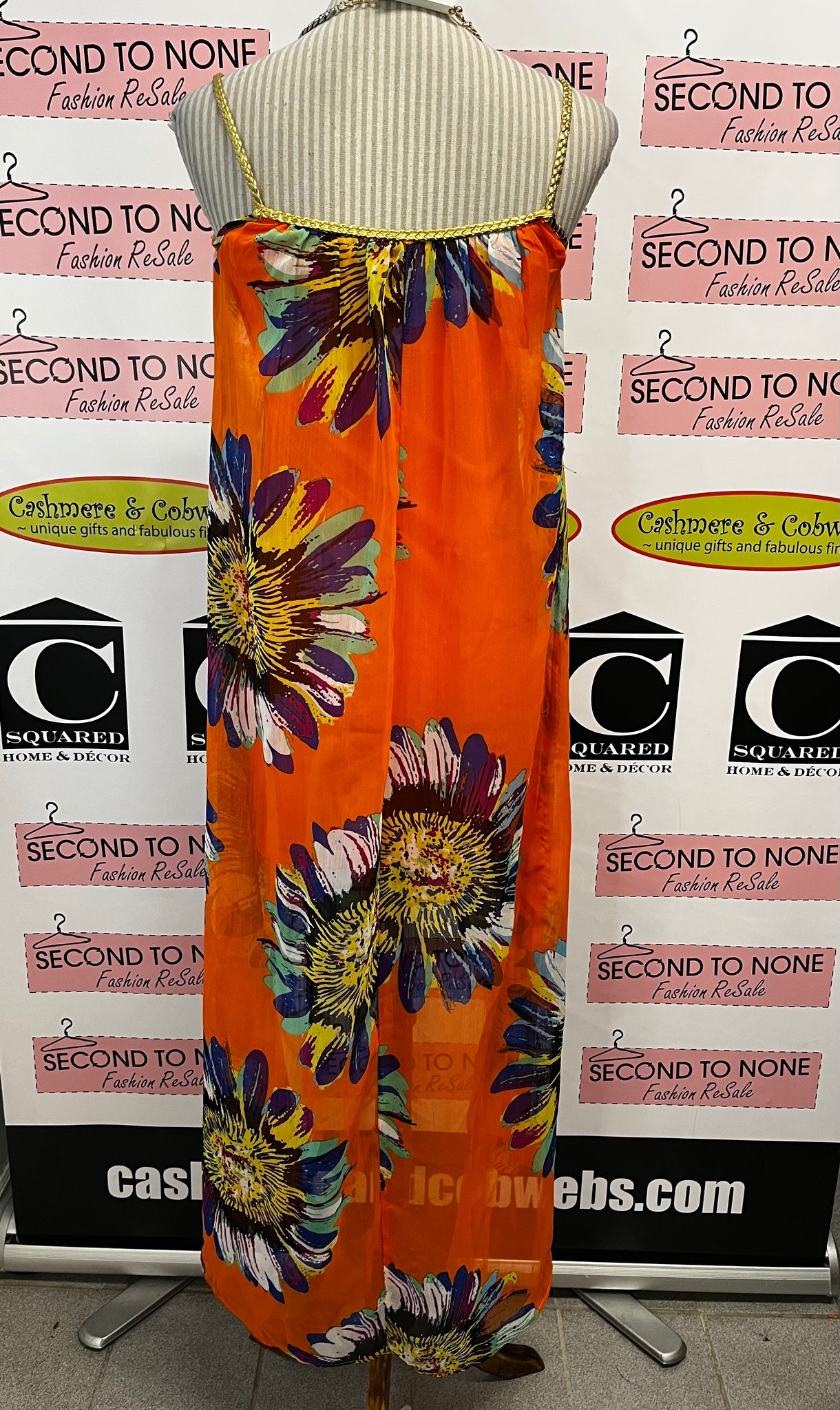 Summer is calling for a playful outfit! This bright orange hi-lo dress is the perfect blend of fun and flirty with its gold braided straps and vibrant floral print. Great for warm weather, this dress by Seductions will be your go-to for any outdoor event.