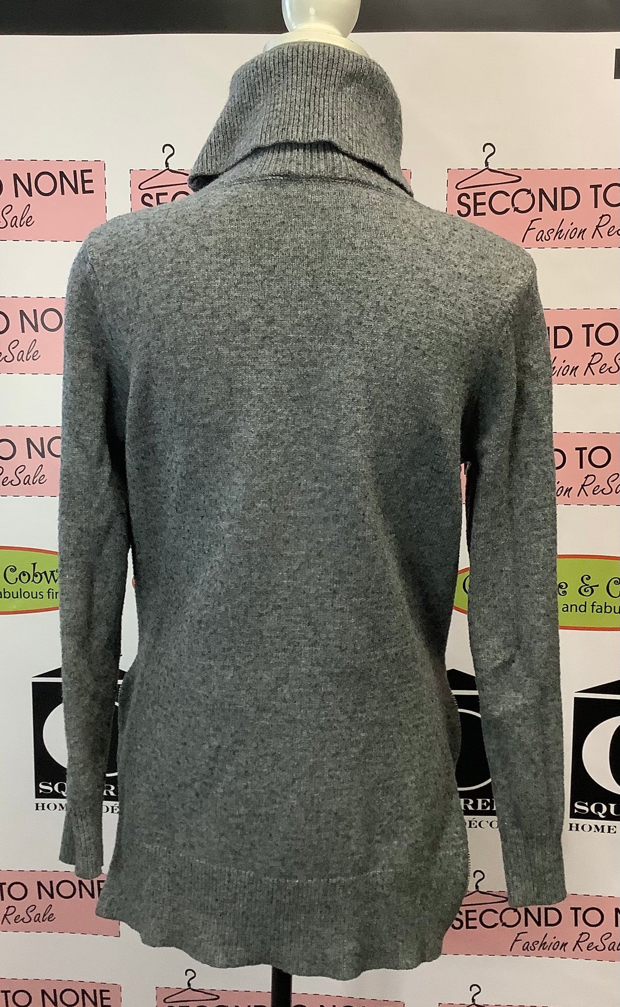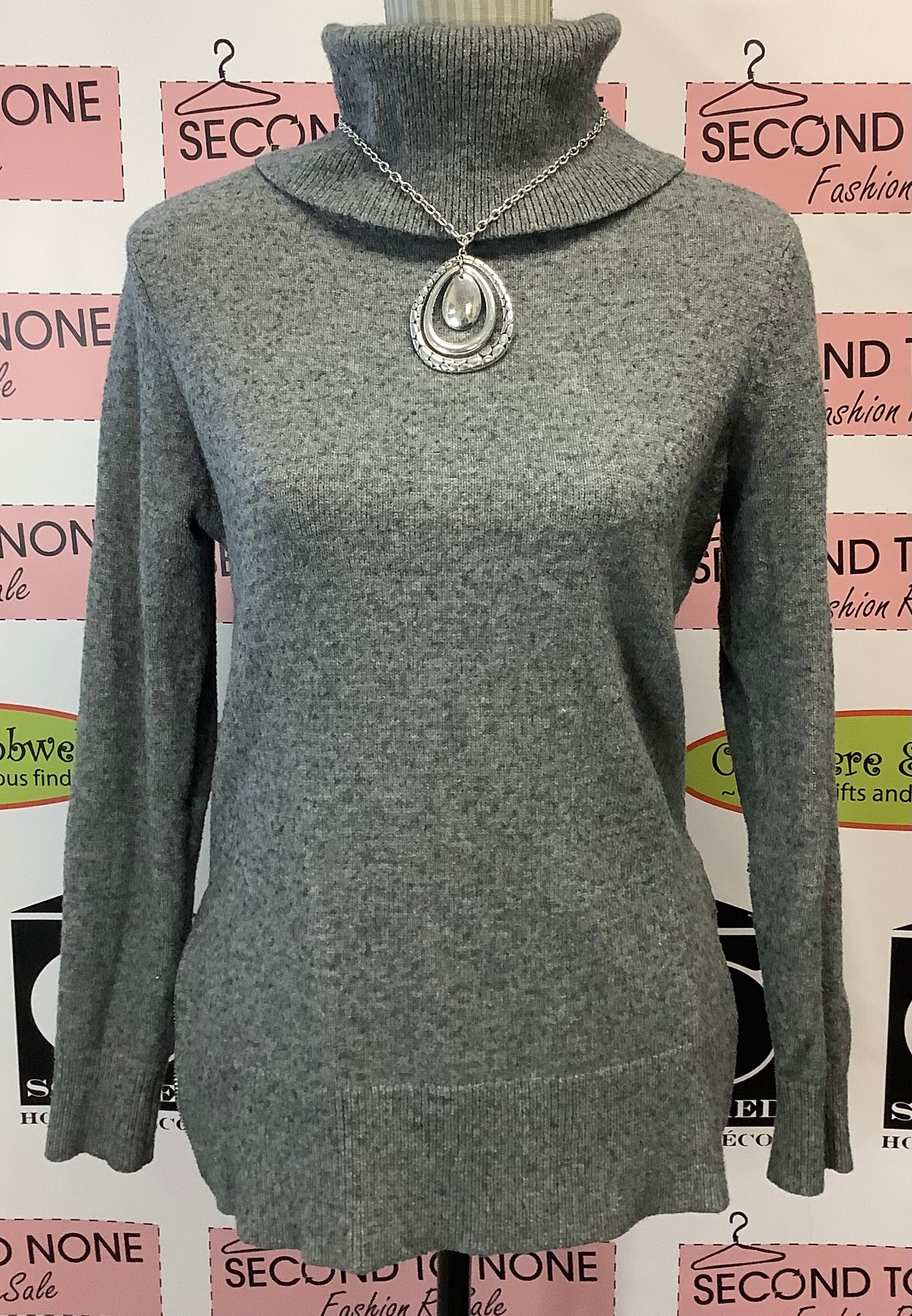 Stay warm and stylish in this grey knitted top from Seven Sisters. This long-sleeve top features a turtleneck for extra comfort, with side slits with zipper trim to add an edgy appeal. Its longer back provides comfortable coverage. Perfect for the winter season! 50% Viscose, 28% Polyester, 22% Nylon.