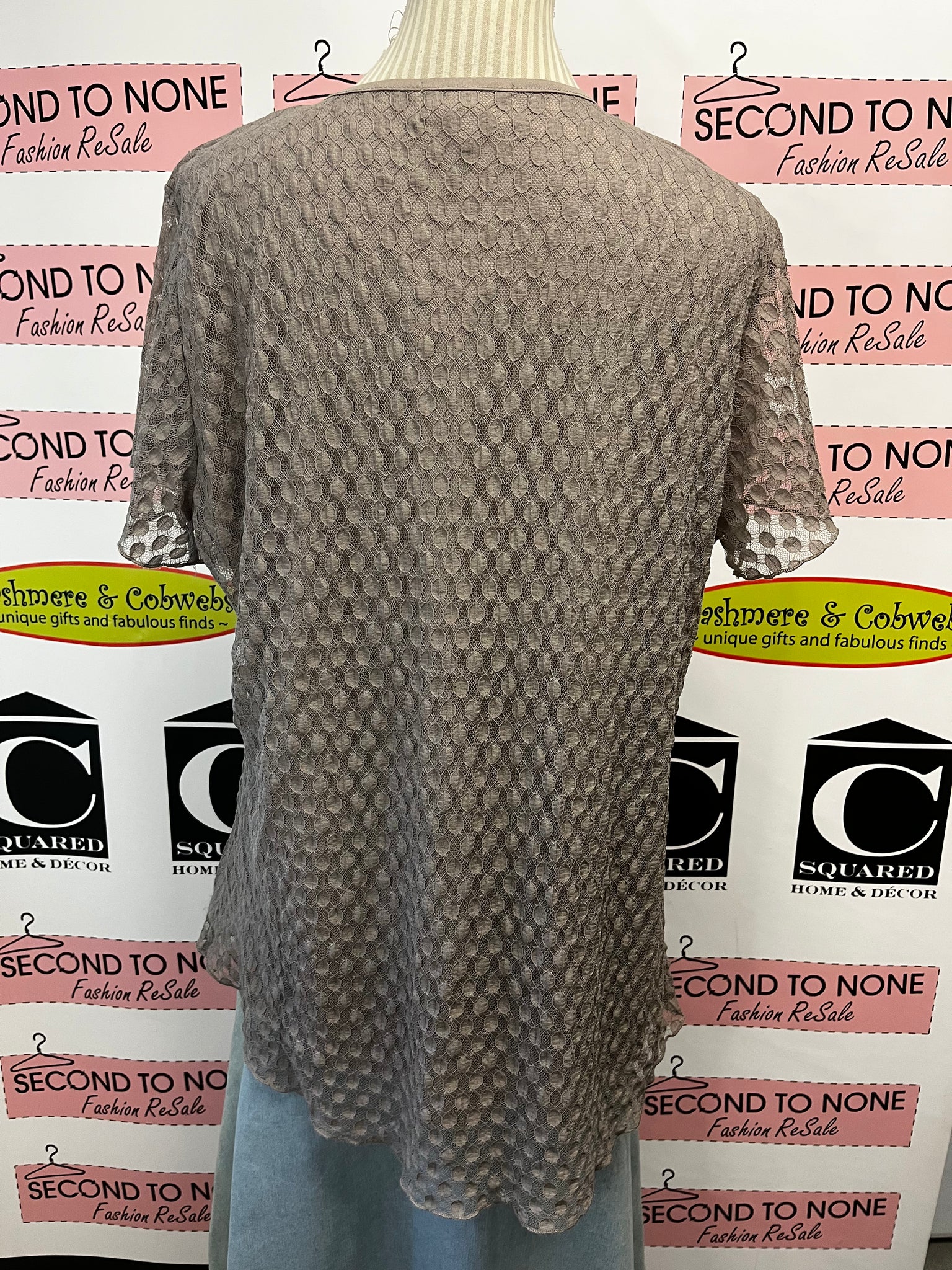 Introducing the Shannon Ford Lavender Lace Top! This elevated everyday top features a beautiful muted grayish lavender colour, transparent lace sleeves, and a v-neck with cross straps design. Lightweight and girly, this top is perfect for adding a playful touch to your wardrobe. Size 1X.