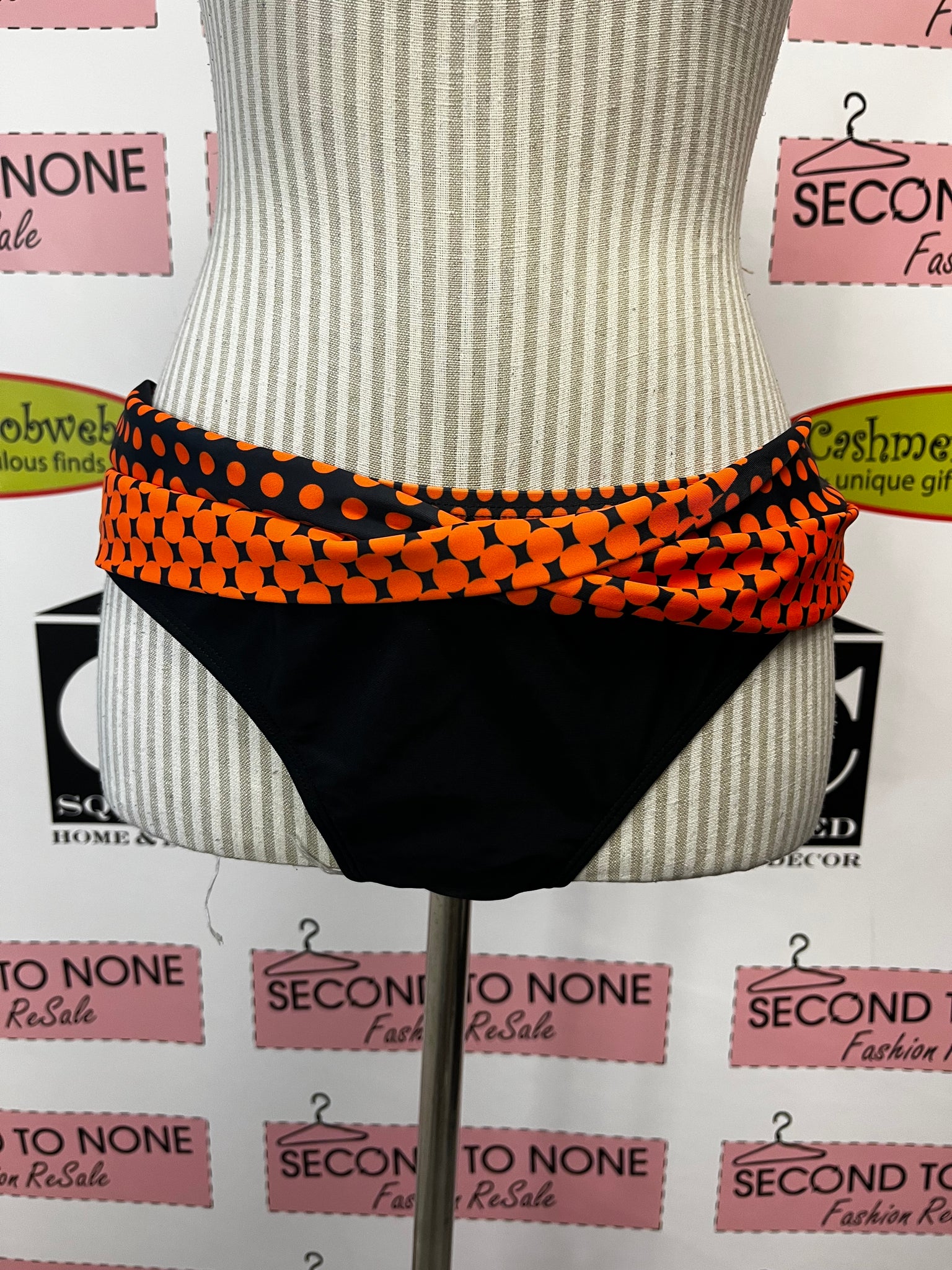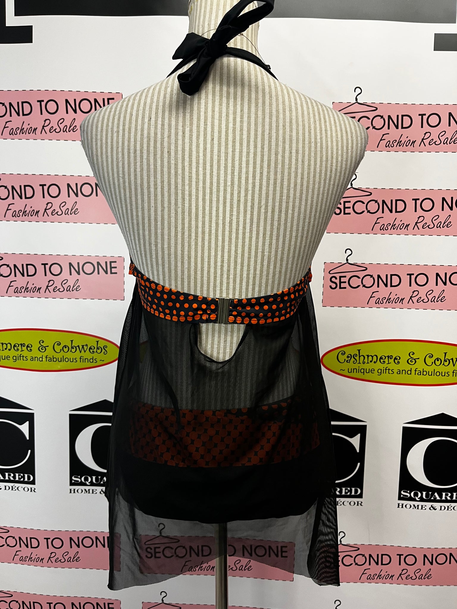 Turn heads at the beach with this playful black and orange print halter bikini, featuring a draped sheer panel that adds a flirty touch. The criss-cross straps create a fun, stylish look while providing a secure fit. Perfect for those who want to mix bold colors with breezy elegance in a Size XL fit.