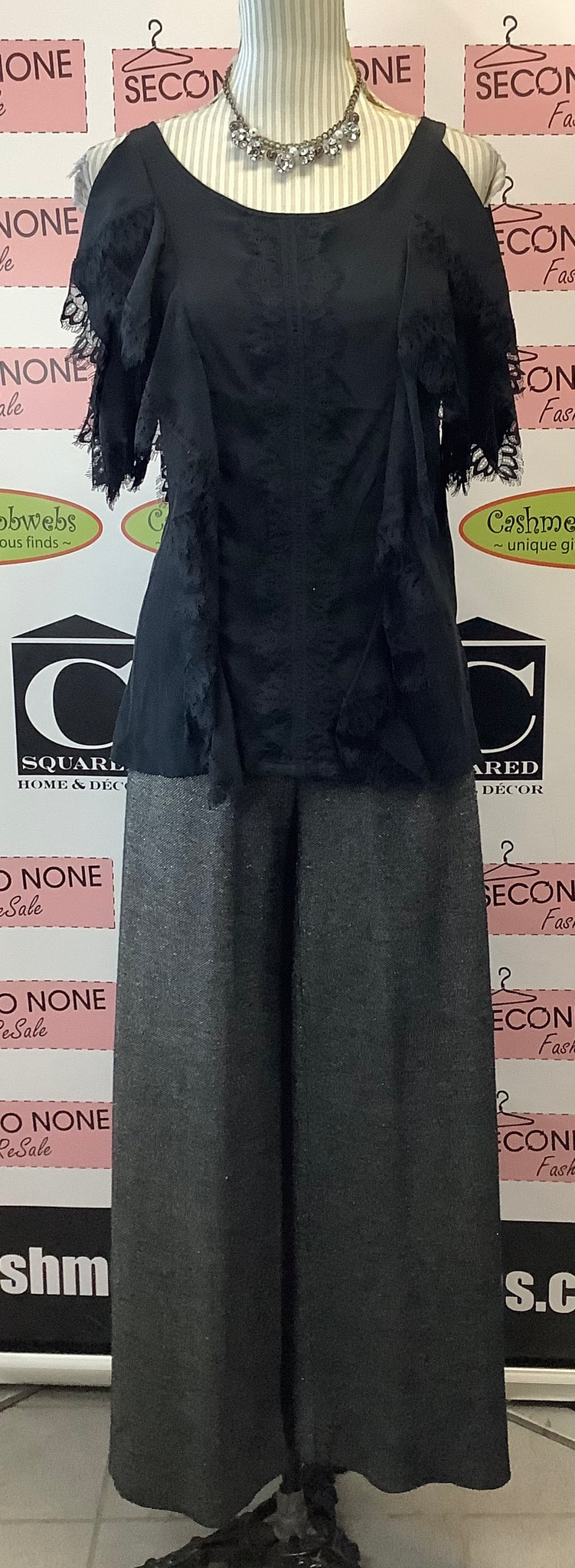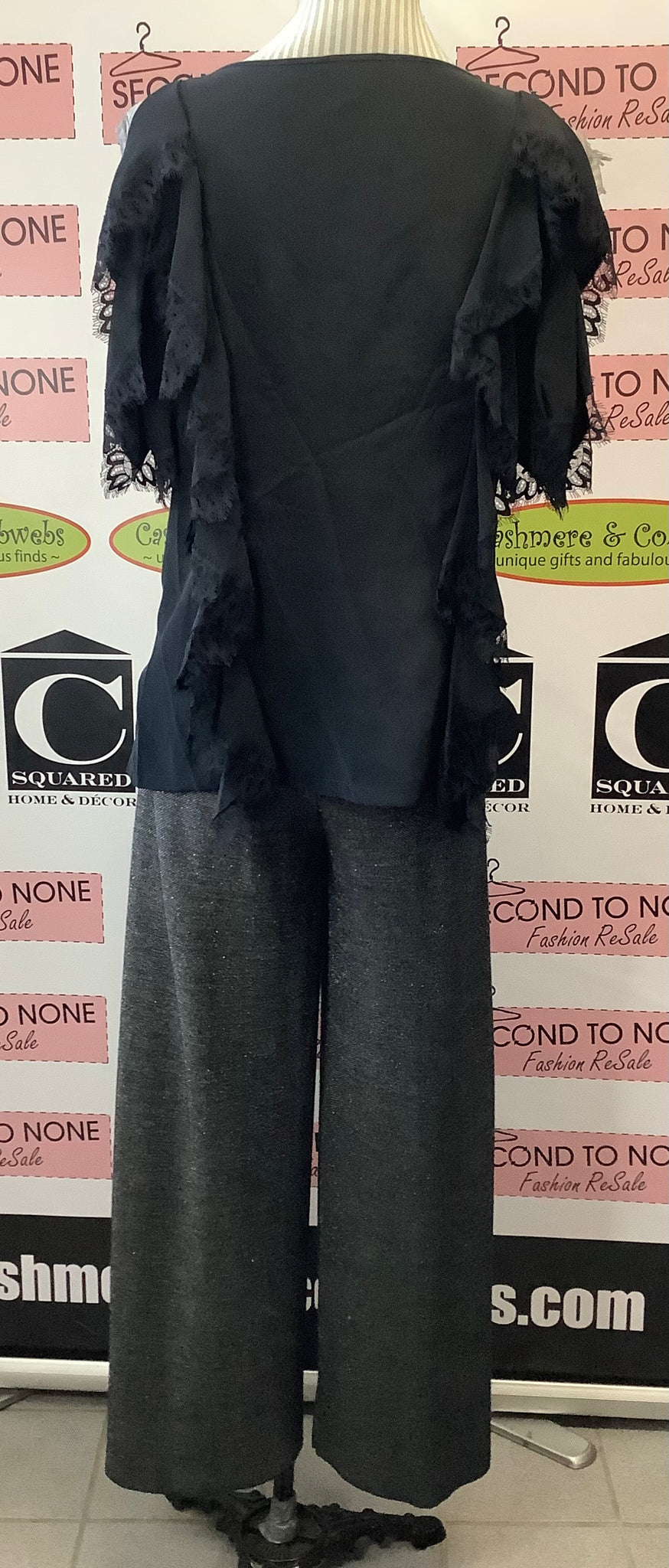 This black, cold shoulder top offers luxury and sophistication, with its silk fabric and delicate lace trim. Its timeless silhouette features short sleeves, a rounded neckline and a long fit, ensuring elegance and style. A perfect piece to add a touch of refinement to any wardrobe. Made in U.S.A. 100% Silk. Lace 100% Nylon.