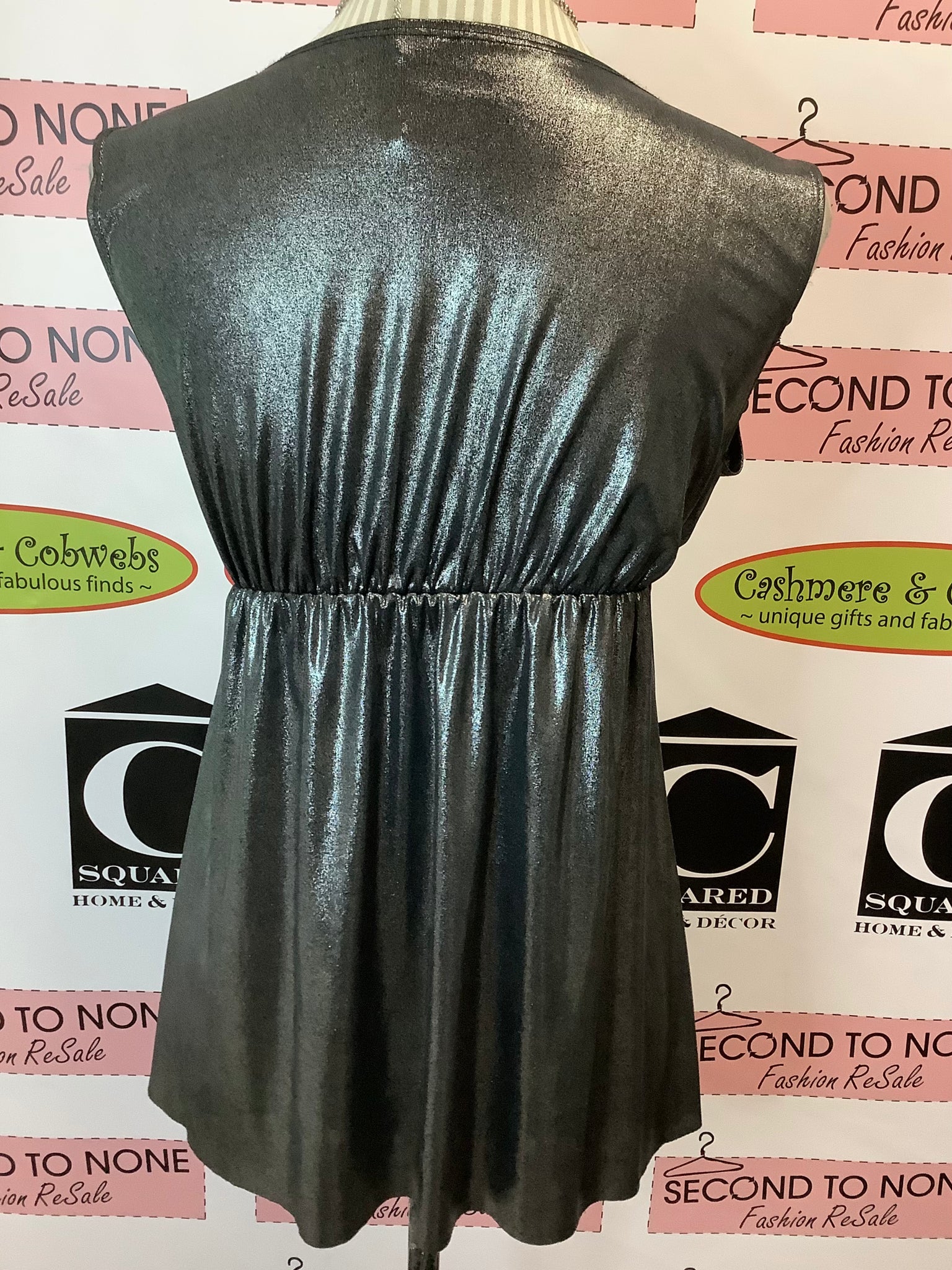 Be a goddess in our shimmery Silver Goddess Tank. The metallic all over design will make you stand out in any crowd. With a deep v-neck and flowy fit, this tank is both flattering and fun. Available in size S. (Sorry,Beyoncé not included) Size not indicated but fits like a S.