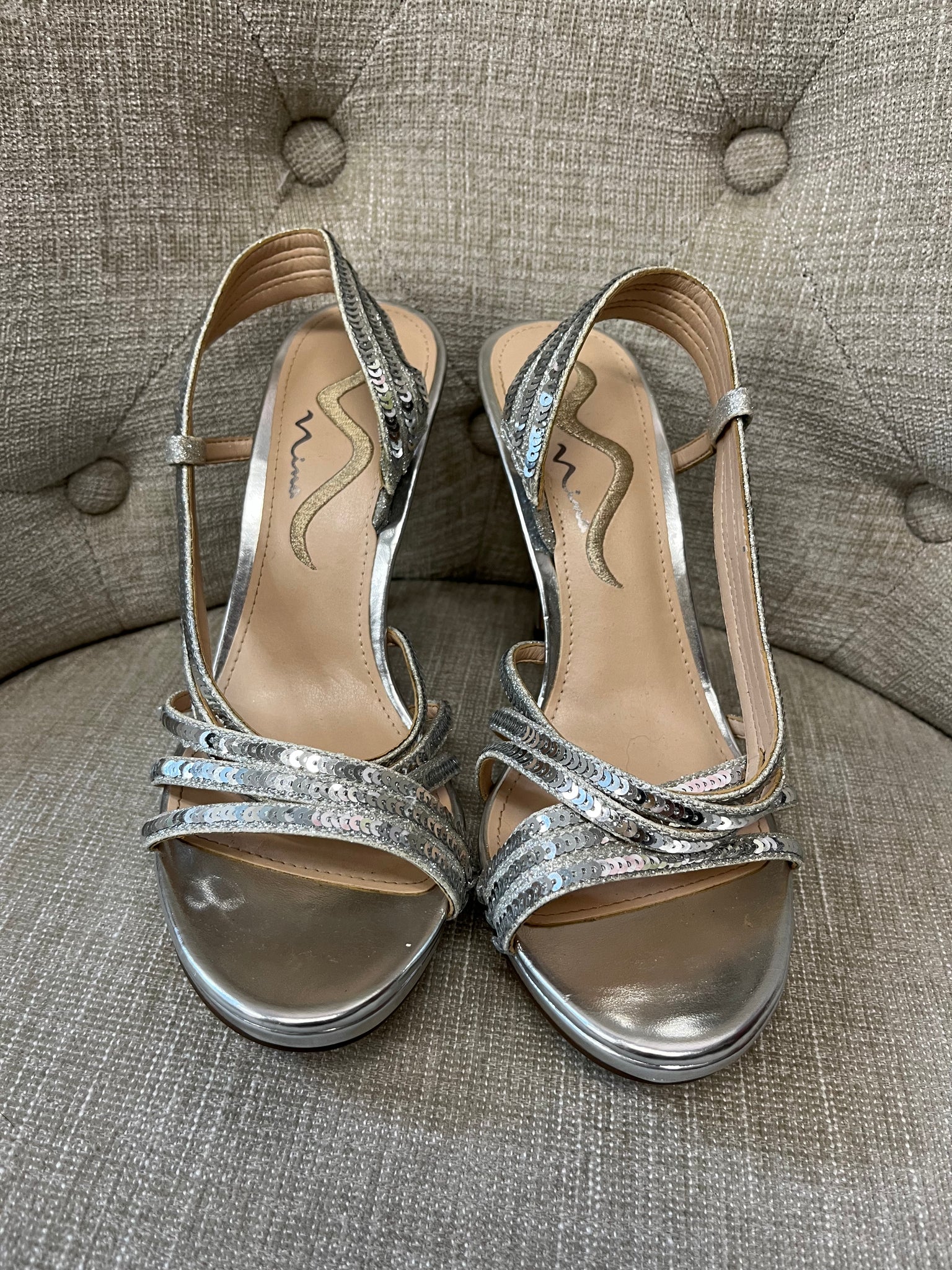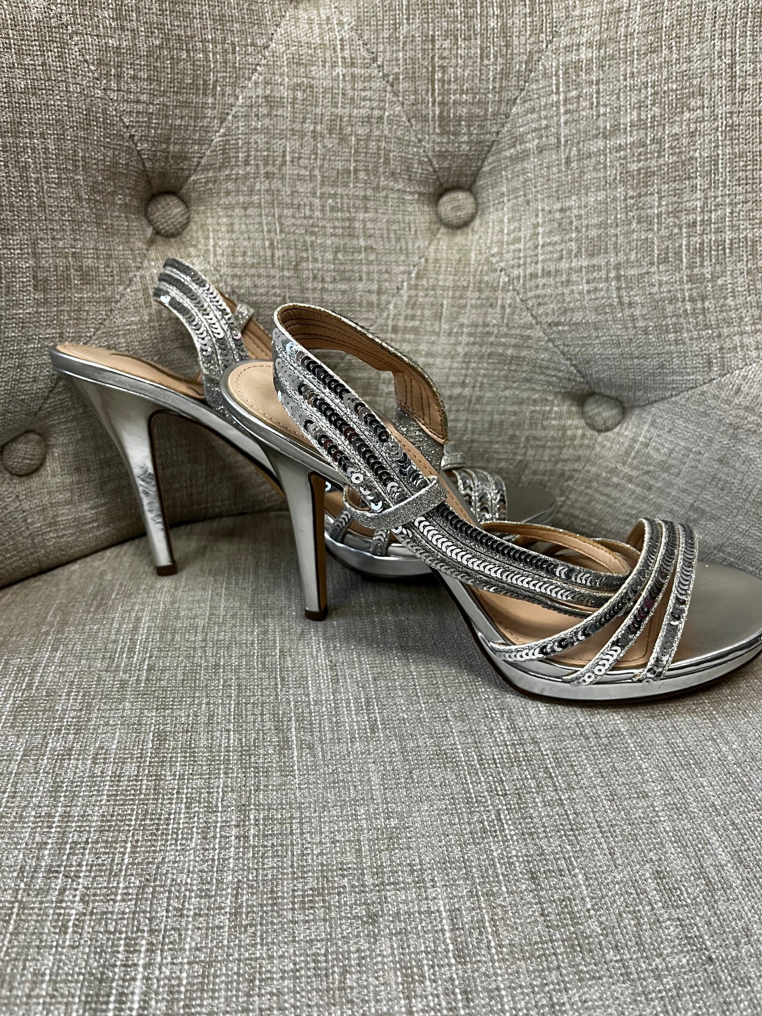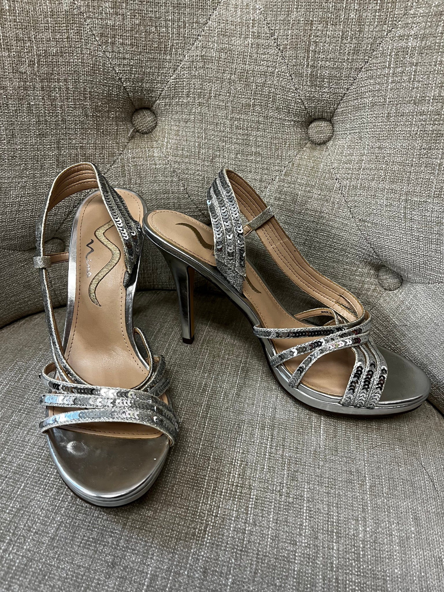 Get ready to sparkle with these Silver Sequin Heels by Nina. With an open-toed design and lots of shiny sequins, these strappy heels are perfect for turning heads at any fancy event. Standing tall at 4 inches with a skinny heel, you'll feel confident and glamorous with every step.