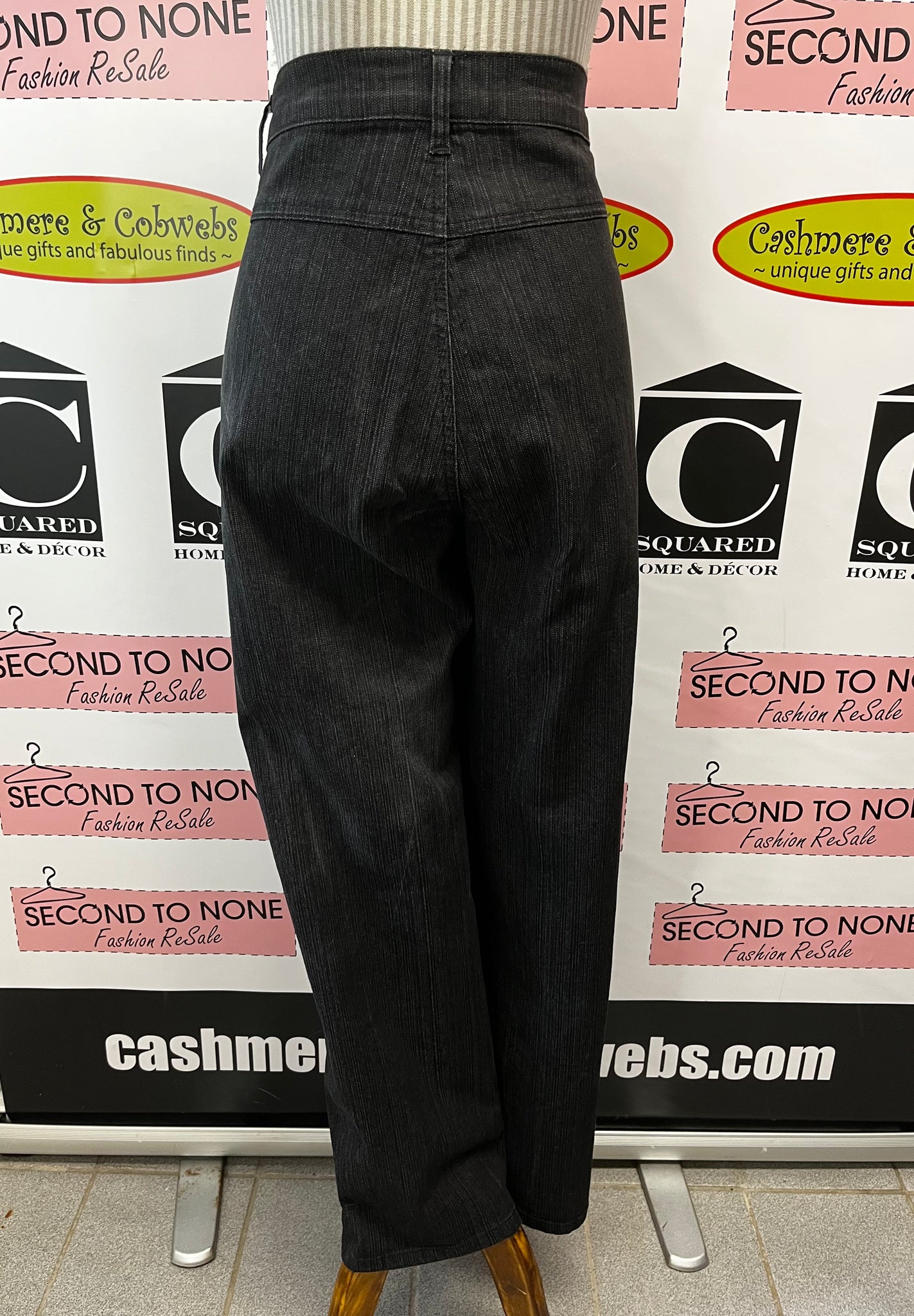 Step out in style with the Simon Chang Pinstripe Jeans! Featuring a sleek black denim fabric adorned with crisp white pinstripes, these jeans bring a fun twist to your wardrobe. Made from a comfy cotton blend with just the right stretch, they move with you all day long. Perfect for adding a dash of chic playfulness to your casual look. Get ready to turn heads and feel fabulous in size 16!
