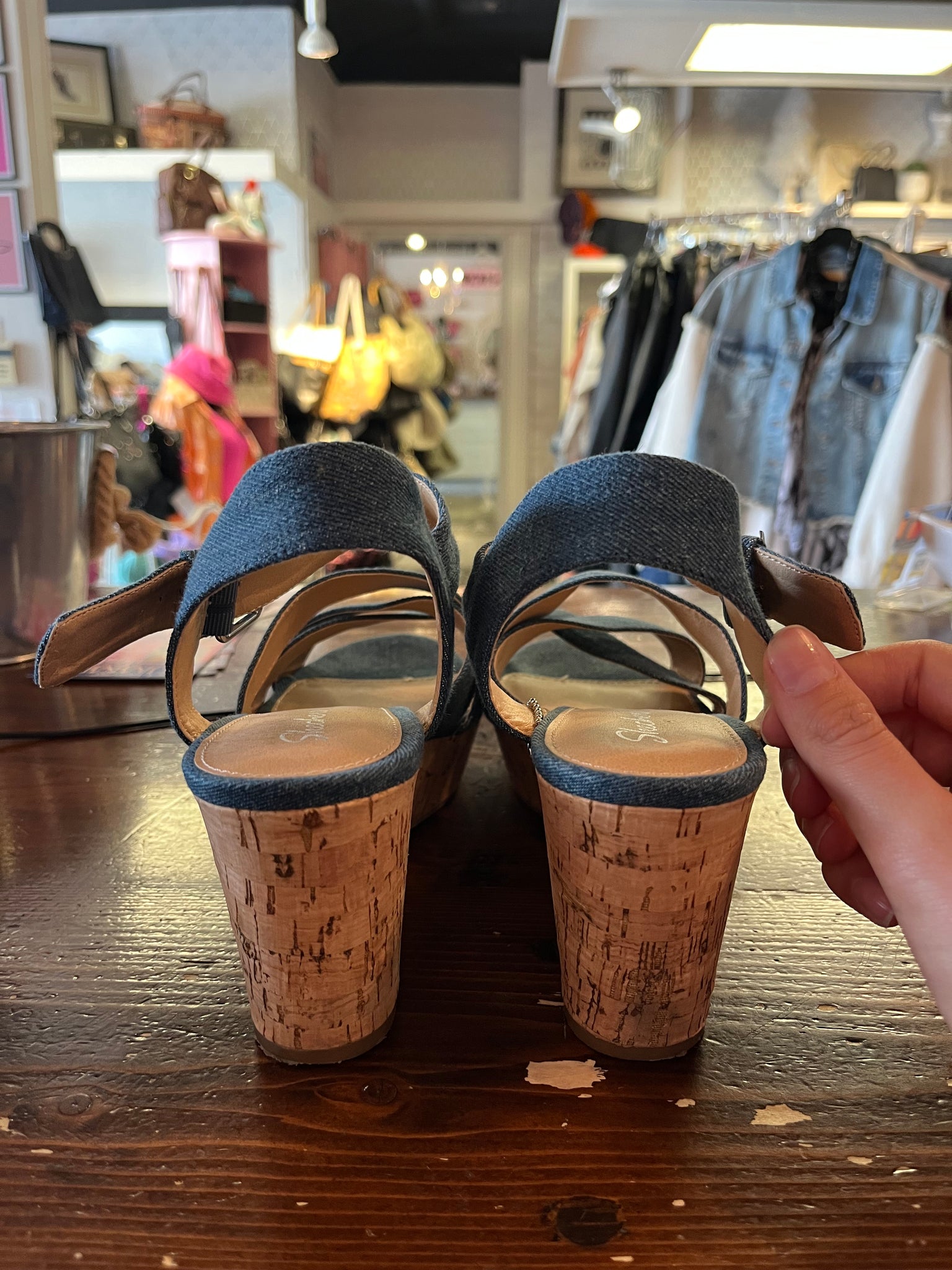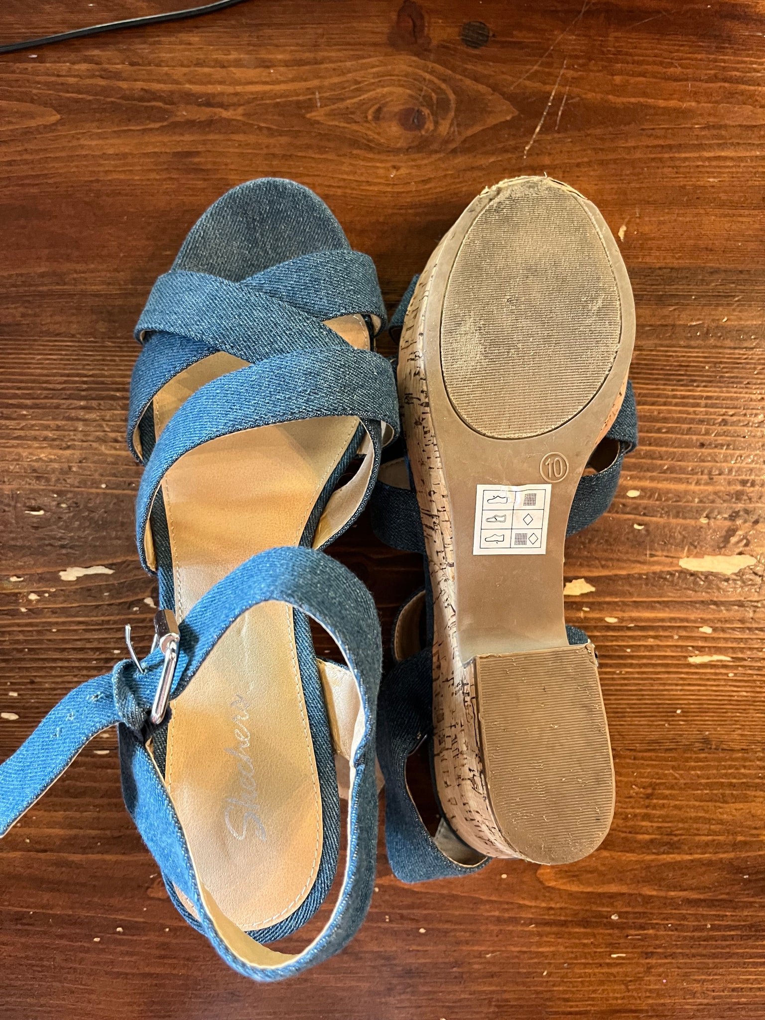Step up your style with these unique and playful denim platform heels from Skechers. Featuring a 1.2 inch cork platform and a 3.2 inch heel, these elevated sandals are both stylish and comfortable. The adjustable buckle on the heel strap allows for a customized fit, while the softly pointed round toe adds a touch of elegance. Perfect for adding a fun twist to any outfit, these heels are a must-have for any fashion-forward individual. Size 10.