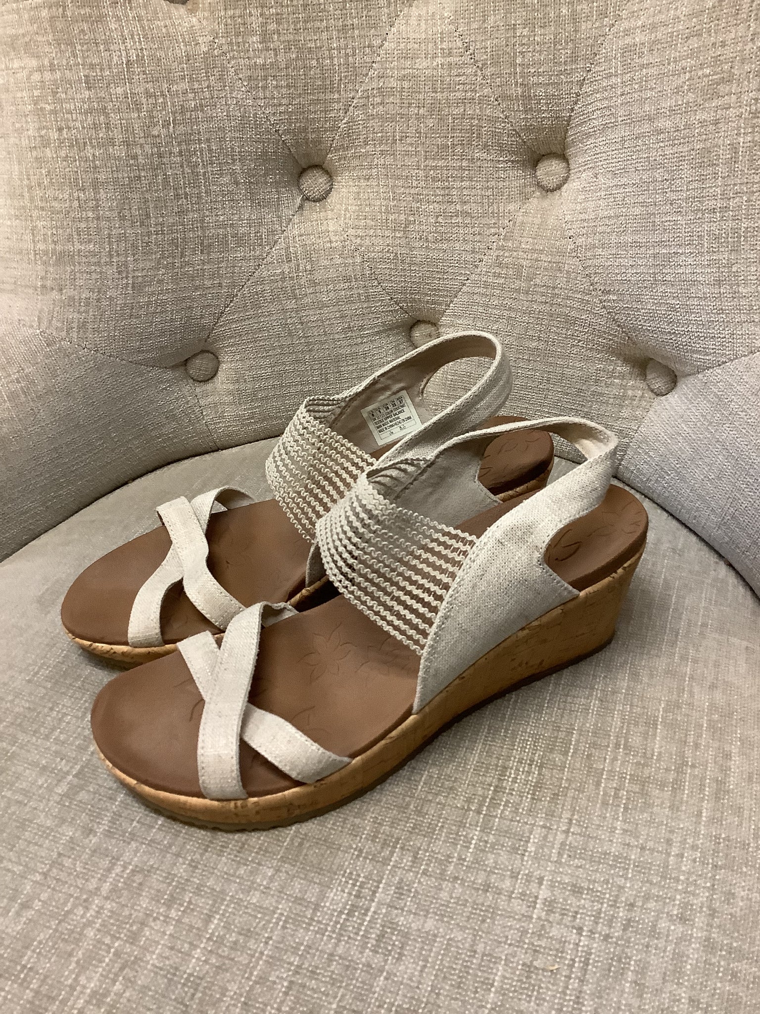 Step into summer fun with these playful Skechers Luxe Foam Sandals! Featuring open-toe, strappy linen and burlap sling backs, their rustic charm pairs perfectly with beach days, cruises, and vacation vibes. The large cork wedge adds a comfortable 3-inch lift, blending style with ease for sunny adventures.
