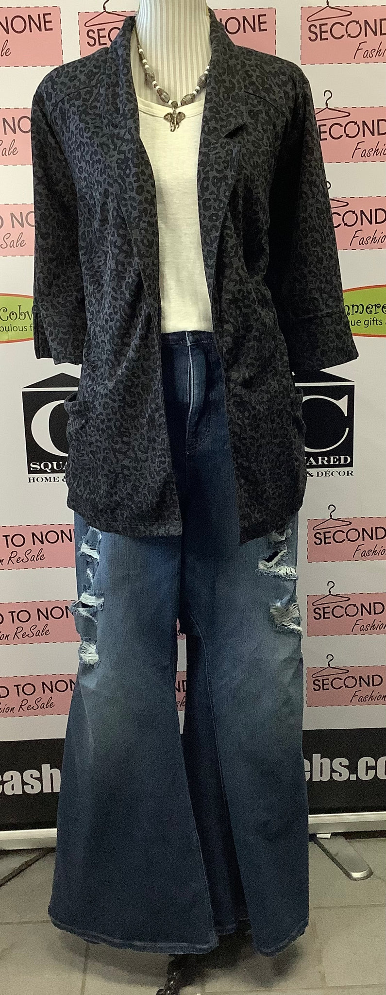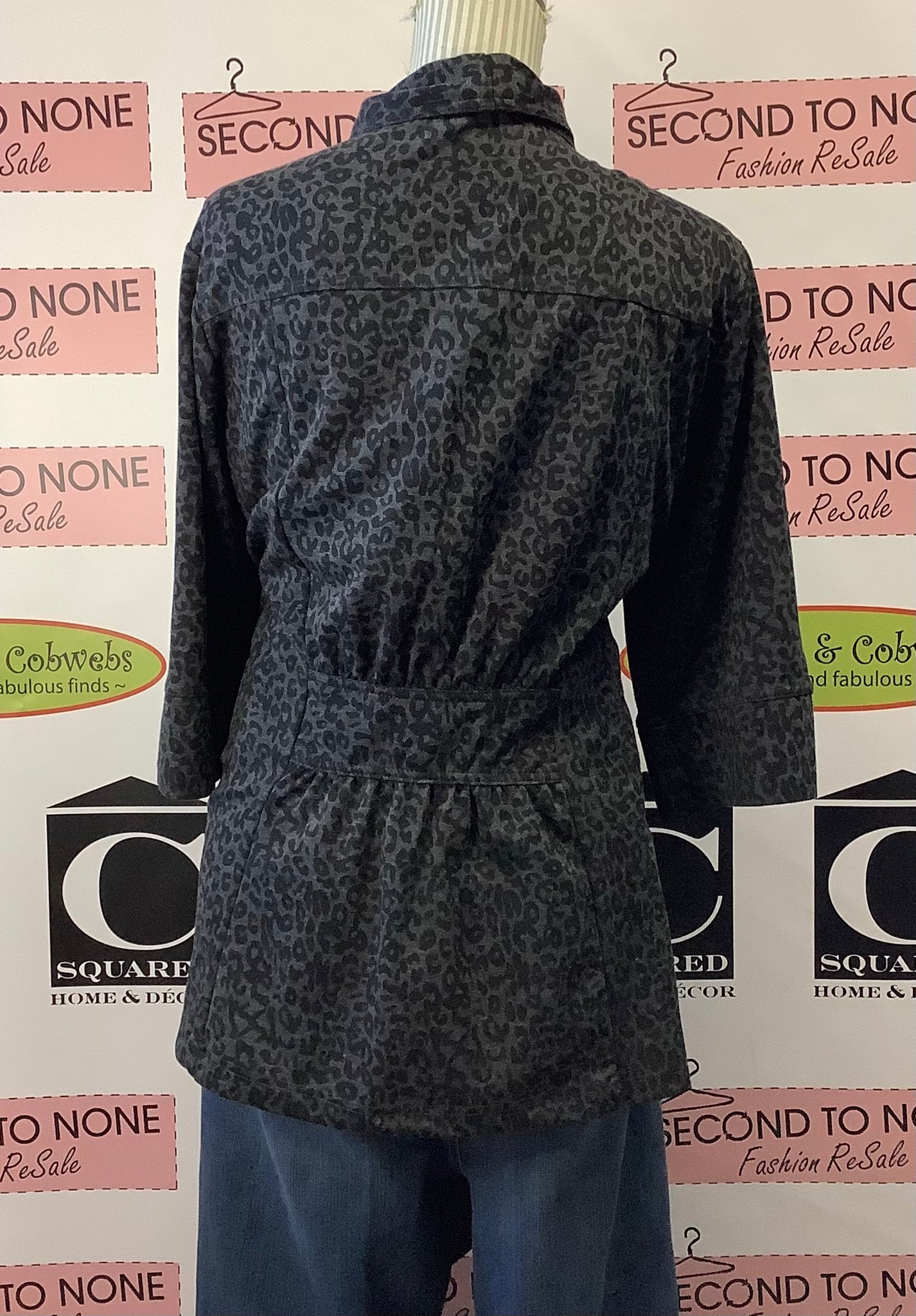 Step out in style with this fun and fashionable animal print blazer. Embrace wild style with its black and grey leopard spots and show off your sassy side with the cropped sleeves and slits! This open fit blazer features a collar and pouch pockets for a touch of practicality. Unleash your inner fashionista with this bold and eye-catching piece! 77% Polyester, 20% Rayon, 3% Spandex.