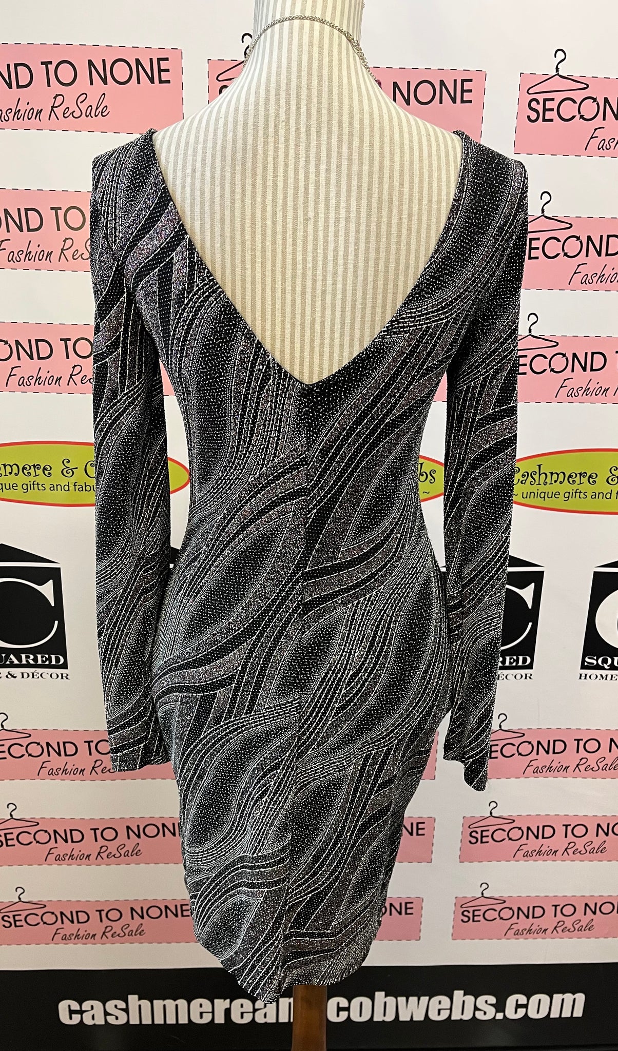 Get ready to shine in our Sparkly All Over Galaxy Dress! Our short length dress features an all over sparkly black and silver design with a galaxy look, perfect for standing out at any event. The long sleeves and plunging v back add a touch of elegance. Available in size S. Order yours today!