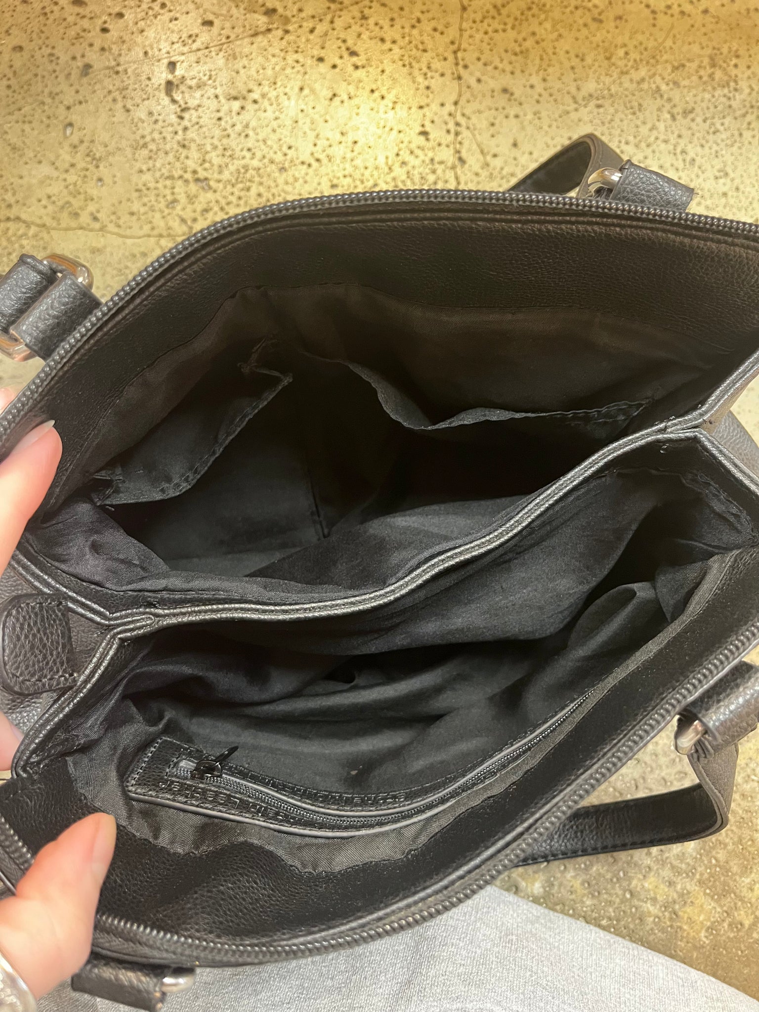 Carry your essentials in style with this sleek Stone Mountain Leather handbag. Crafted from genuine leather, this solid black beauty is as practical as it is chic. Multiple interior pockets keep your keys, phone, and lipstick exactly where you left them—no more digging through the abyss! Perfect for work, weekend adventures, or anywhere life takes you. A timeless piece that works as hard as you do.