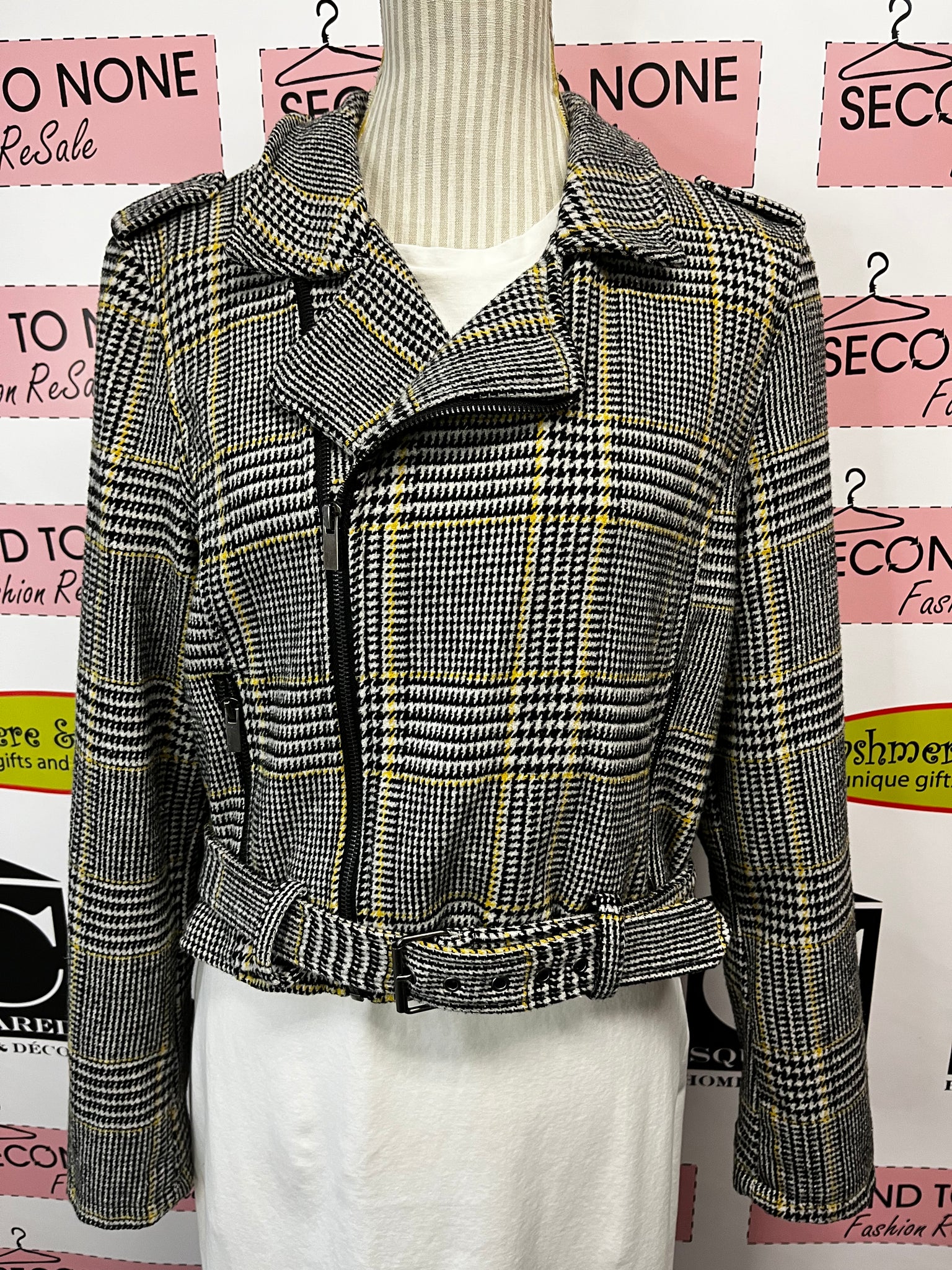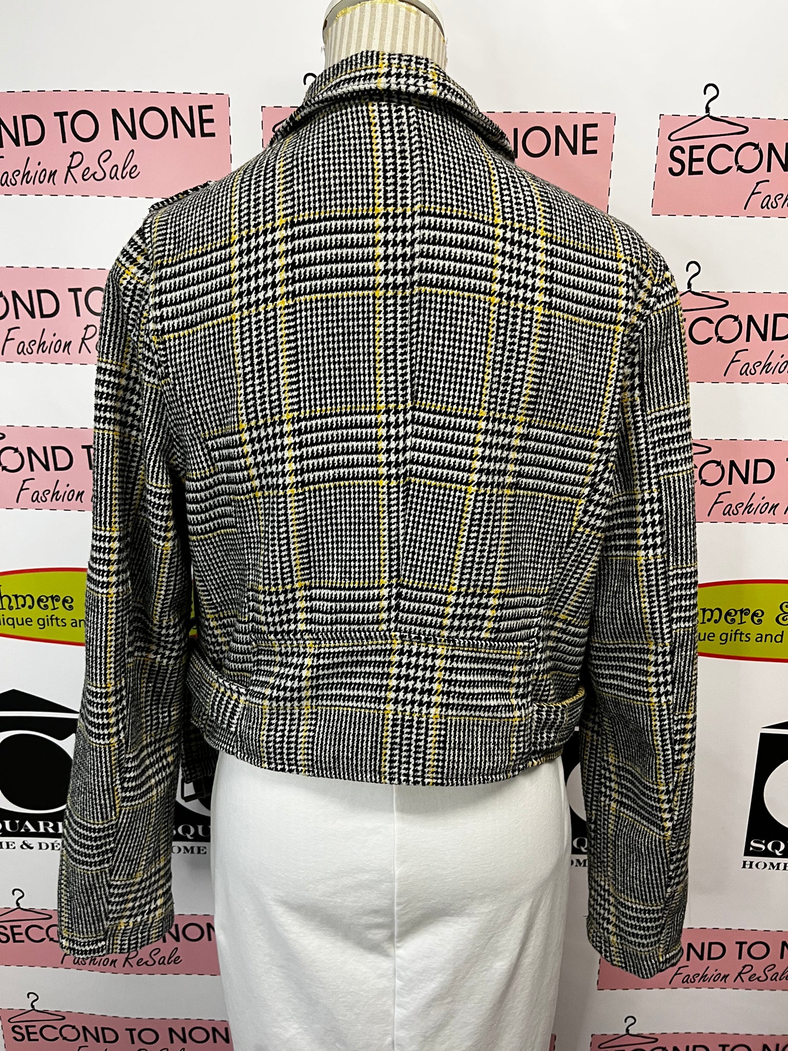 Add a touch of playful edge to your wardrobe with the Stoosh Houndstooth Jacket. Featuring a black, white, and yellow houndstooth pattern and a zip-up front, this biker jacket combines a classic tweed-like material with a modern twist. Make a statement with this unique and stylish jacket from Stoosh.