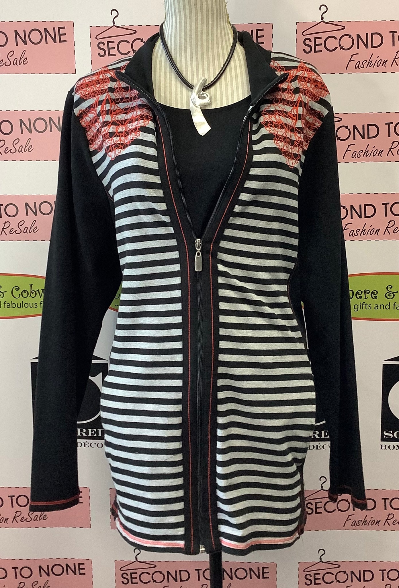 This String Floral & Striped Cardi is the perfect combination of style and comfort. Featuring long sleeves, a zipper closure, gray and black stripes on the front, plain black on the back, and red string floral adornments on the front, this piece is perfect for a unique look. With a collar and slit pockets, this piece is as practical as it is stylish. 95% Cotton, 5% Elastane.
