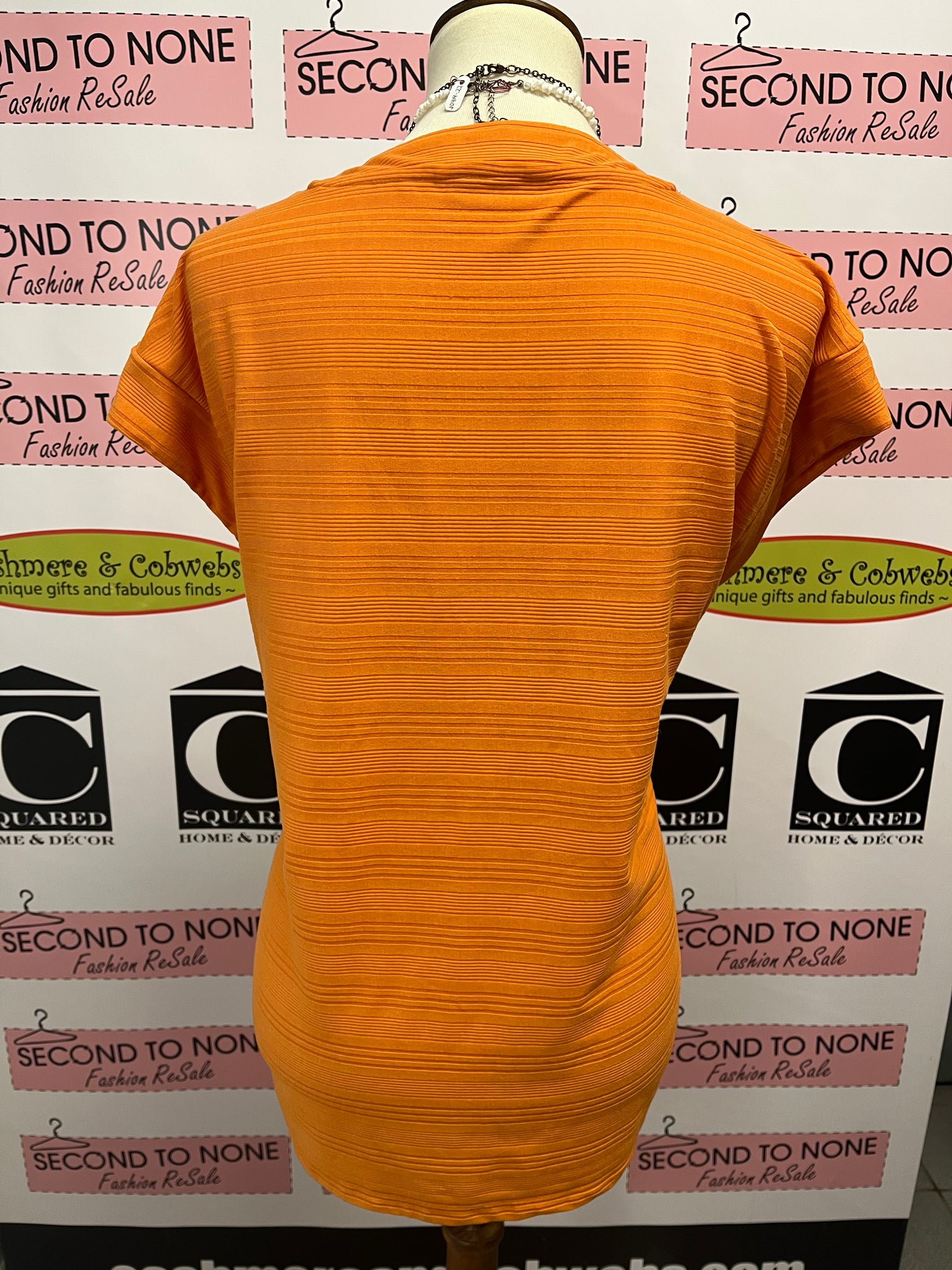 Upgrade your workout wardrobe with our Stripe Texture Active T-Shirt. This size L t-shirt features a solid orange color, v-neckline, and texture stripe details. Stay comfortable and stylish during your workouts.