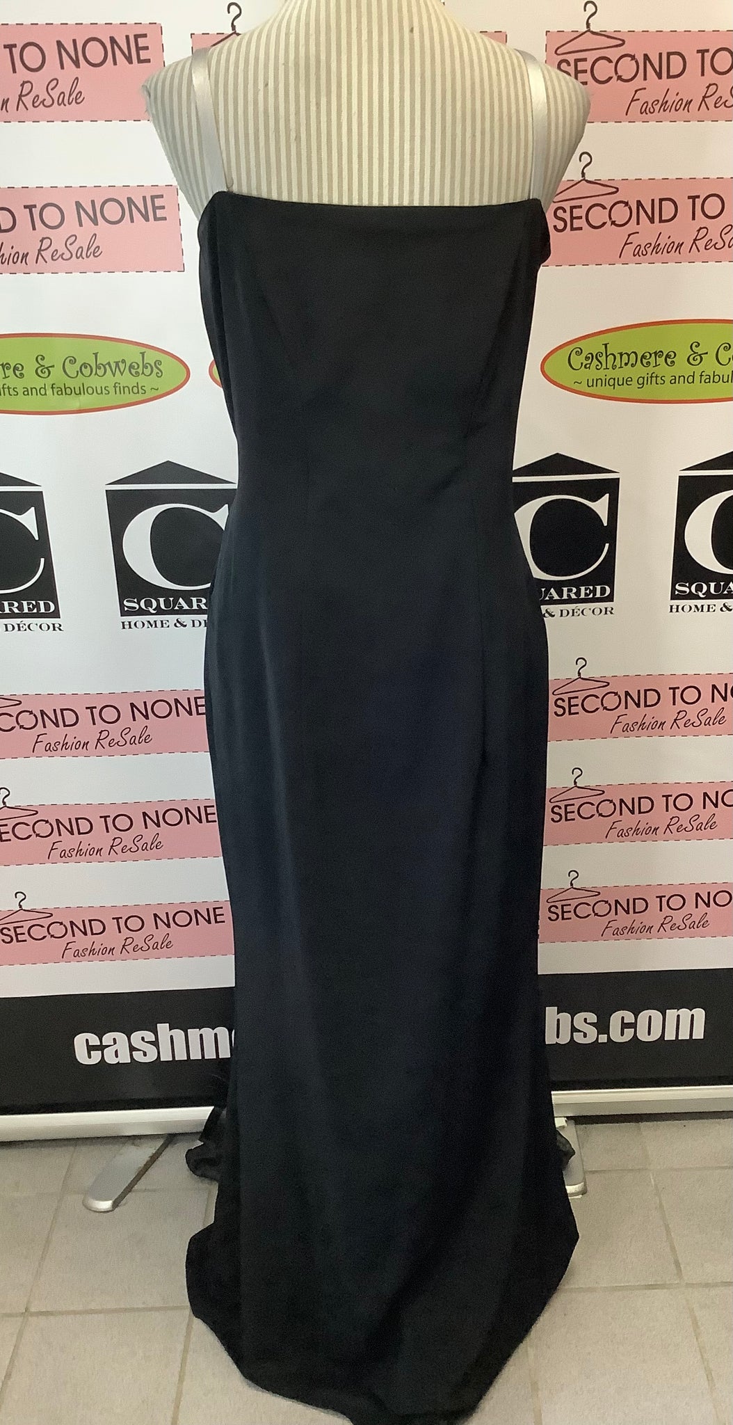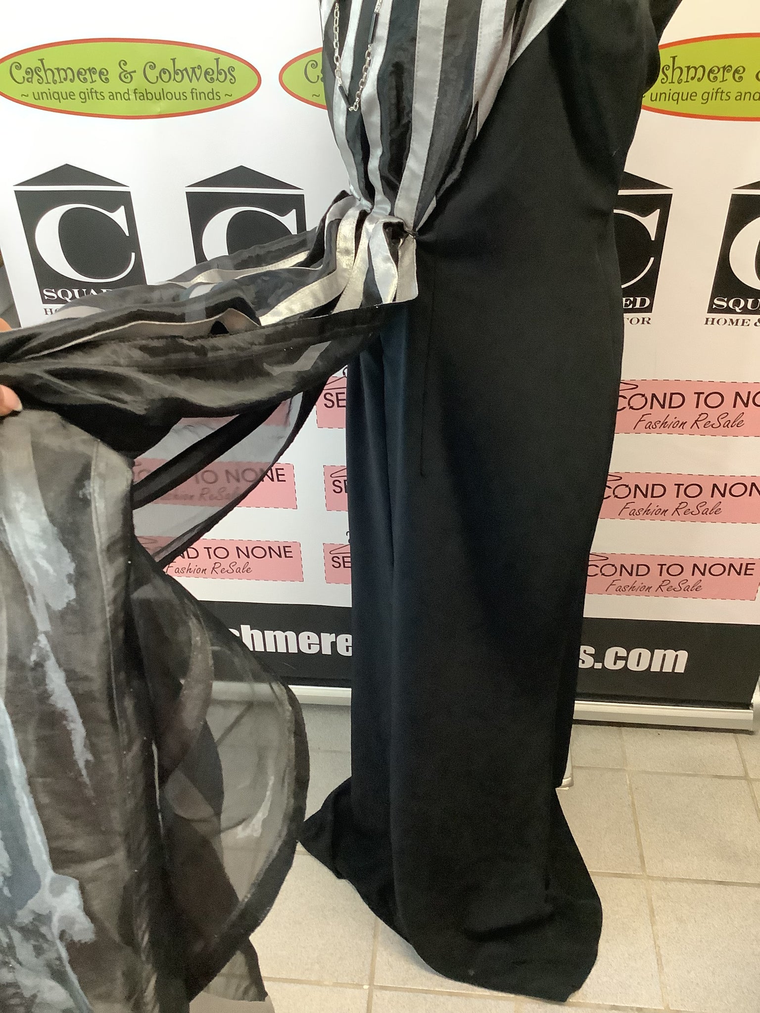 This elegant gown features a striking illusion design, with a layer of sheer purple stripes over a long black maxi dress. The unique overlay is stitched at the waistline and adds a touch of glamour to any special occasion. With a flowy silhouette, purple straps, and a side zipper, this one-of-a-kind gown is perfect for formal events or even as a costume idea. Size is not indicated on gown label but appears to be somewhere between a L/XL.