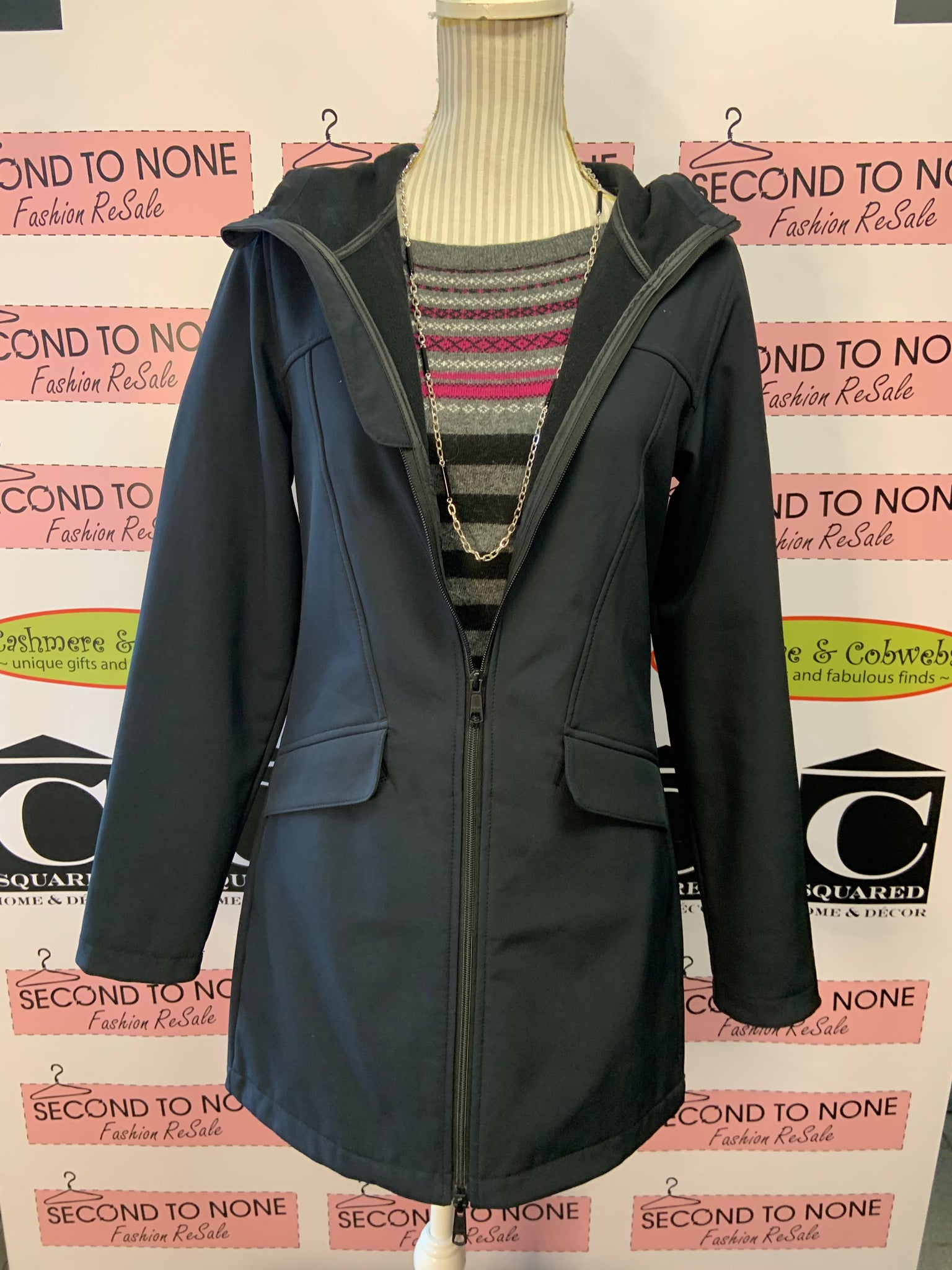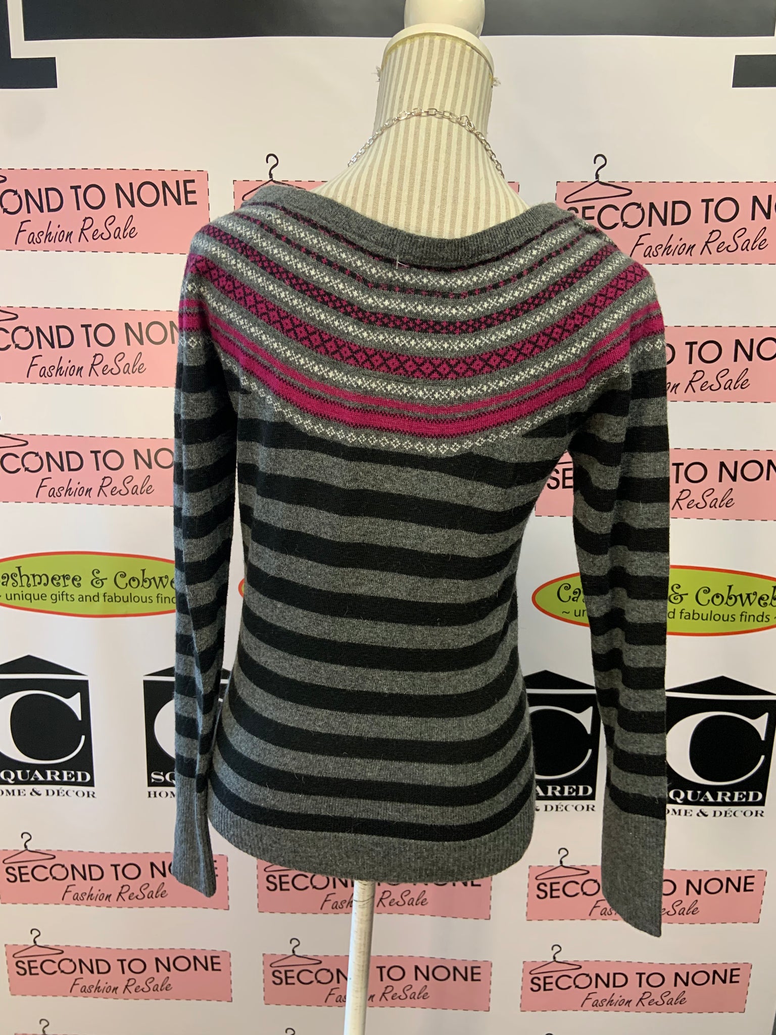 Oxygen, grey and black striped thin sweater with pink and white detailing around the neckline.