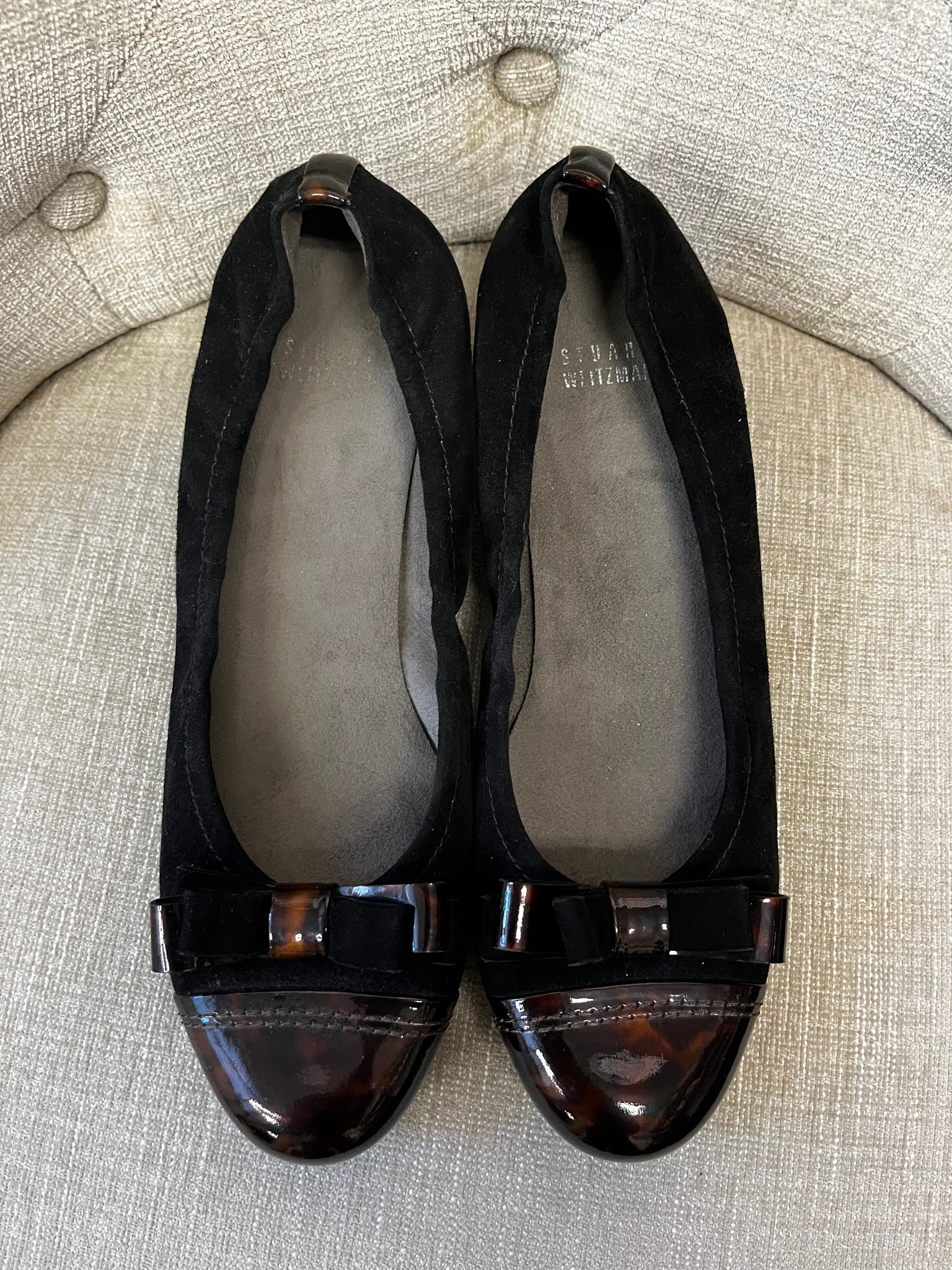 Step into stylish comfort with these Stuart Weitzman heeled flats. Featuring black faux suede material and a charming bow detail on the toe, these size 9 ballet flats offer a subtle 1.5-inch round heel with tortoise shell pattern perfect for adding just the right amount of lift. Whether paired with jeans or a dress, they bring a playful yet polished touch to any outfit.