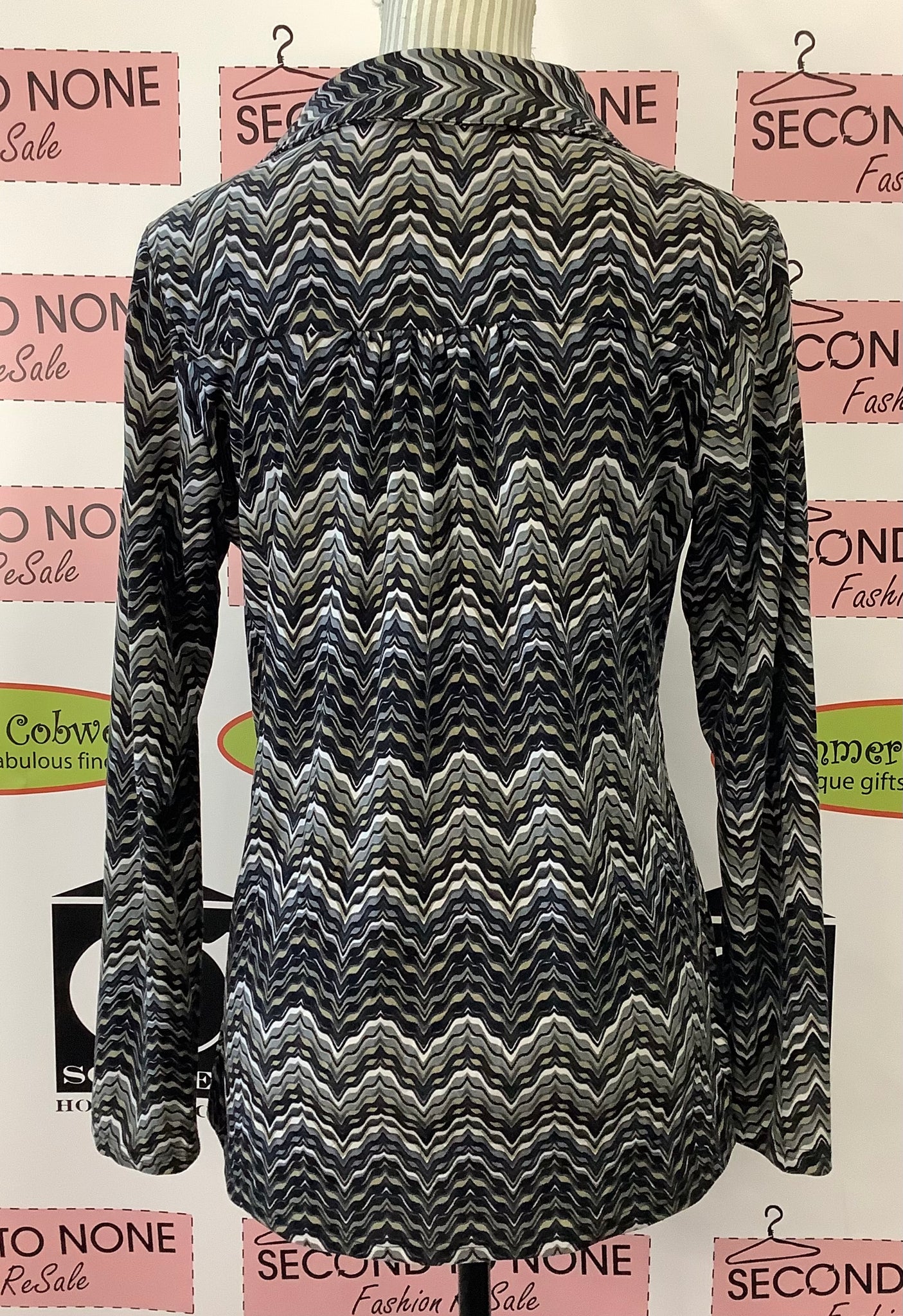 Keep your looks stylin' with this unique, Soft-Touch Squiggle Top. With its v-neck, collar, and button-up design, you'll stay comfy and on-trend. This top's stand-out squiggle pattern is sure to turn heads! Who knew looking awesome could be this easy?! 97% Polyester, 3% Spandex.