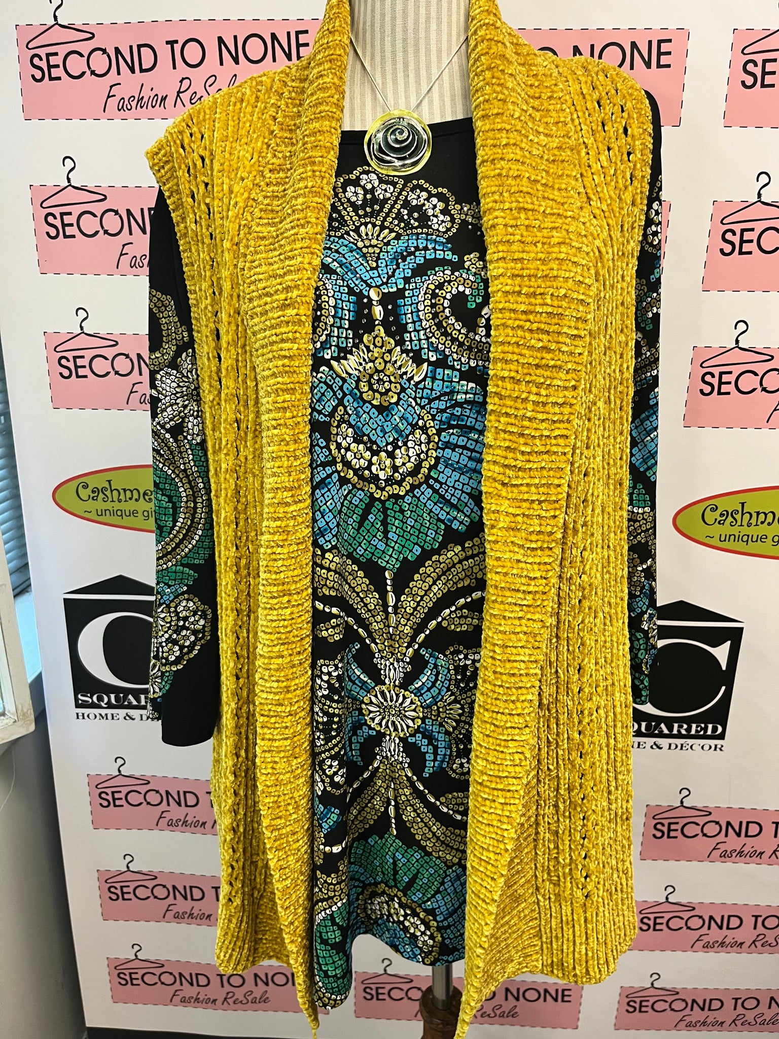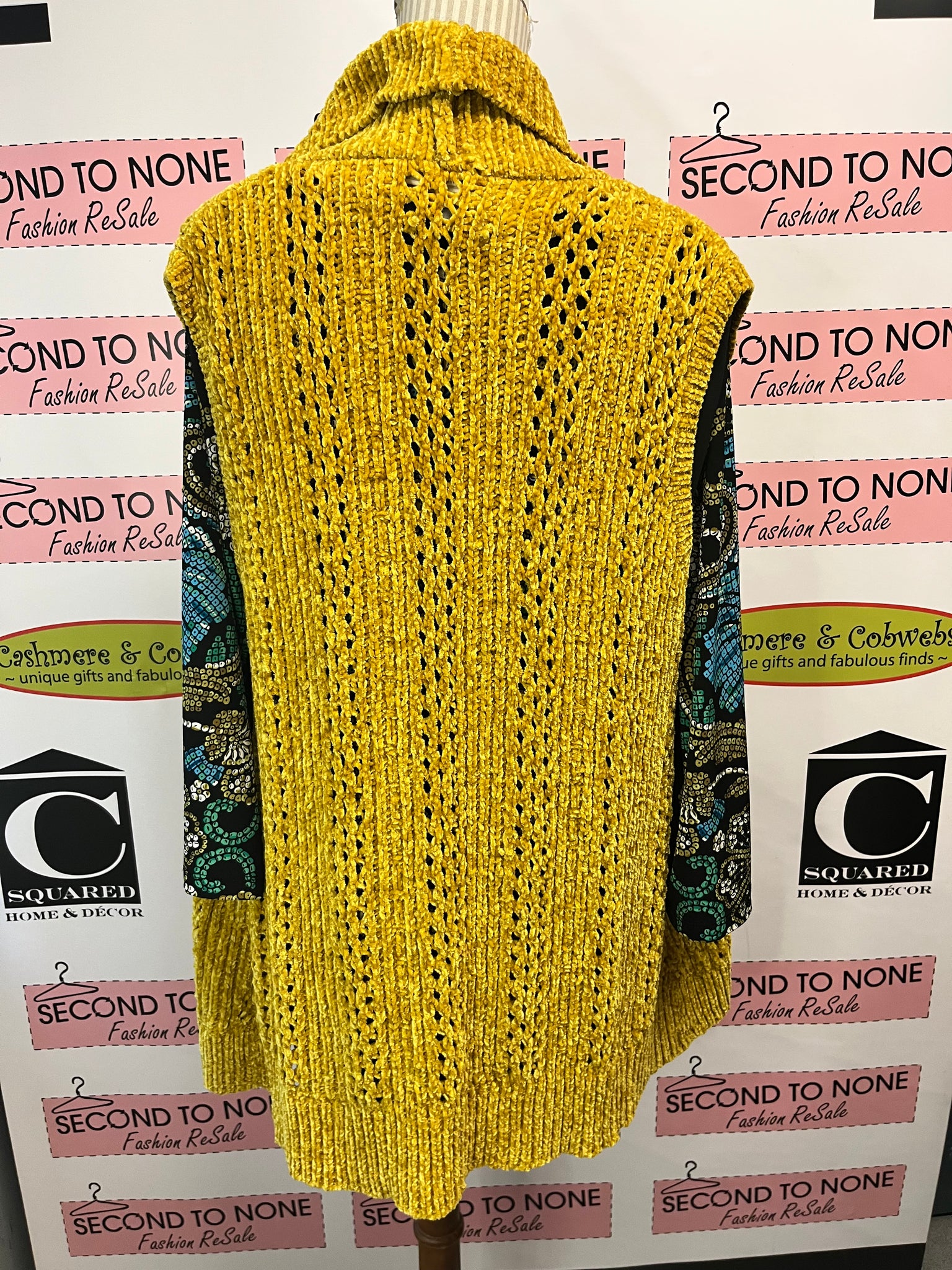 Add a pop of sunny style to your wardrobe with our sunflower yellow chenille knit vest. Perfect for layering, this vest features a cozy open knit design, a longer length for added coverage, and a fold over collar for a touch of sophistication. Upgrade your wardrobe with this playful and versatile piece from C est 1946.