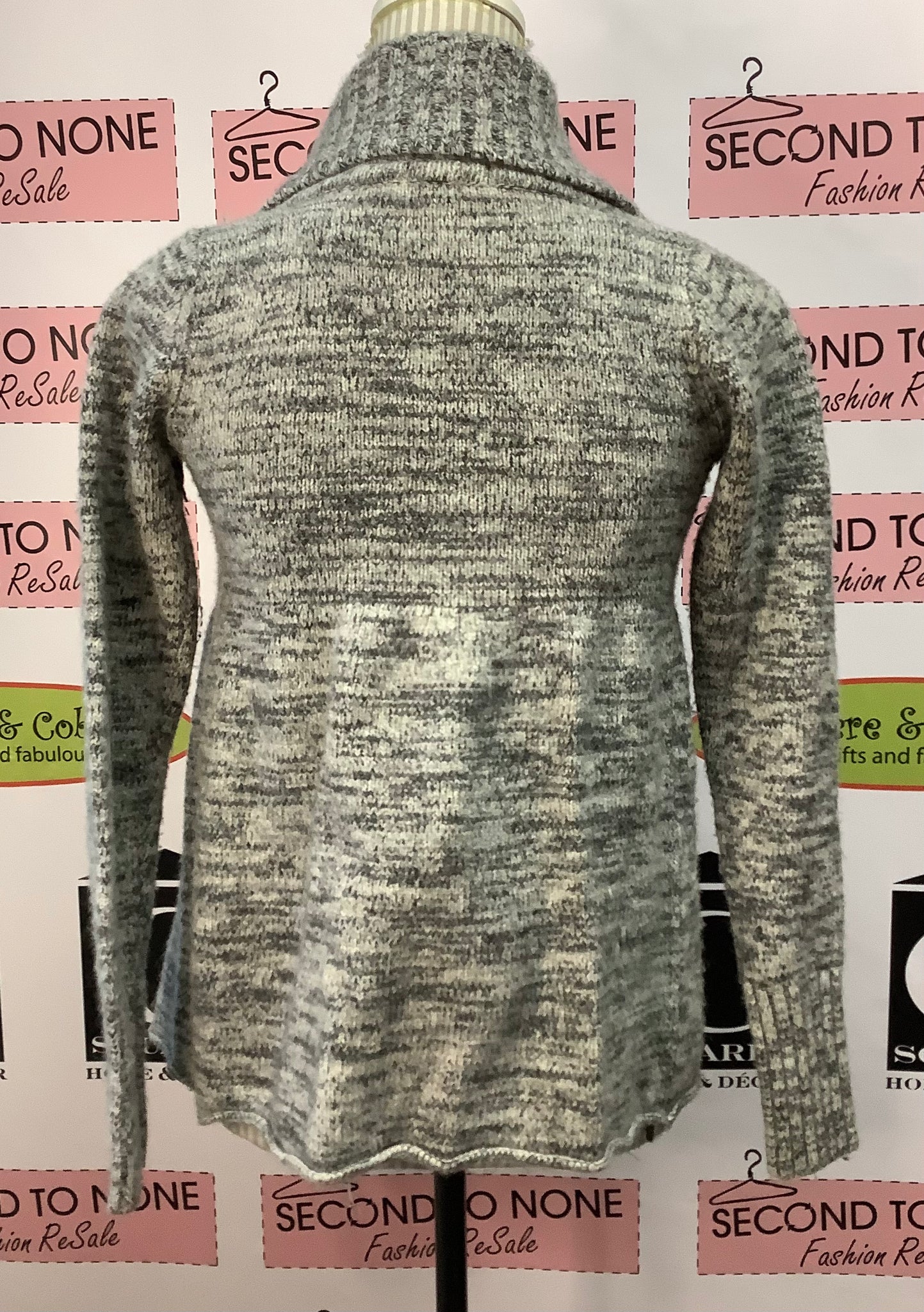 Wrap yourself up in this cuddly, heavy weight knit cardigan. Check out the extended cuffs and collar, gorgeous! Wear this open or closed with the ties and button fastener. Just add a top and jeans! 35% Viscose, 29% Lambswool, 20% Nylon, 8% Angora, 8% Cashmere.