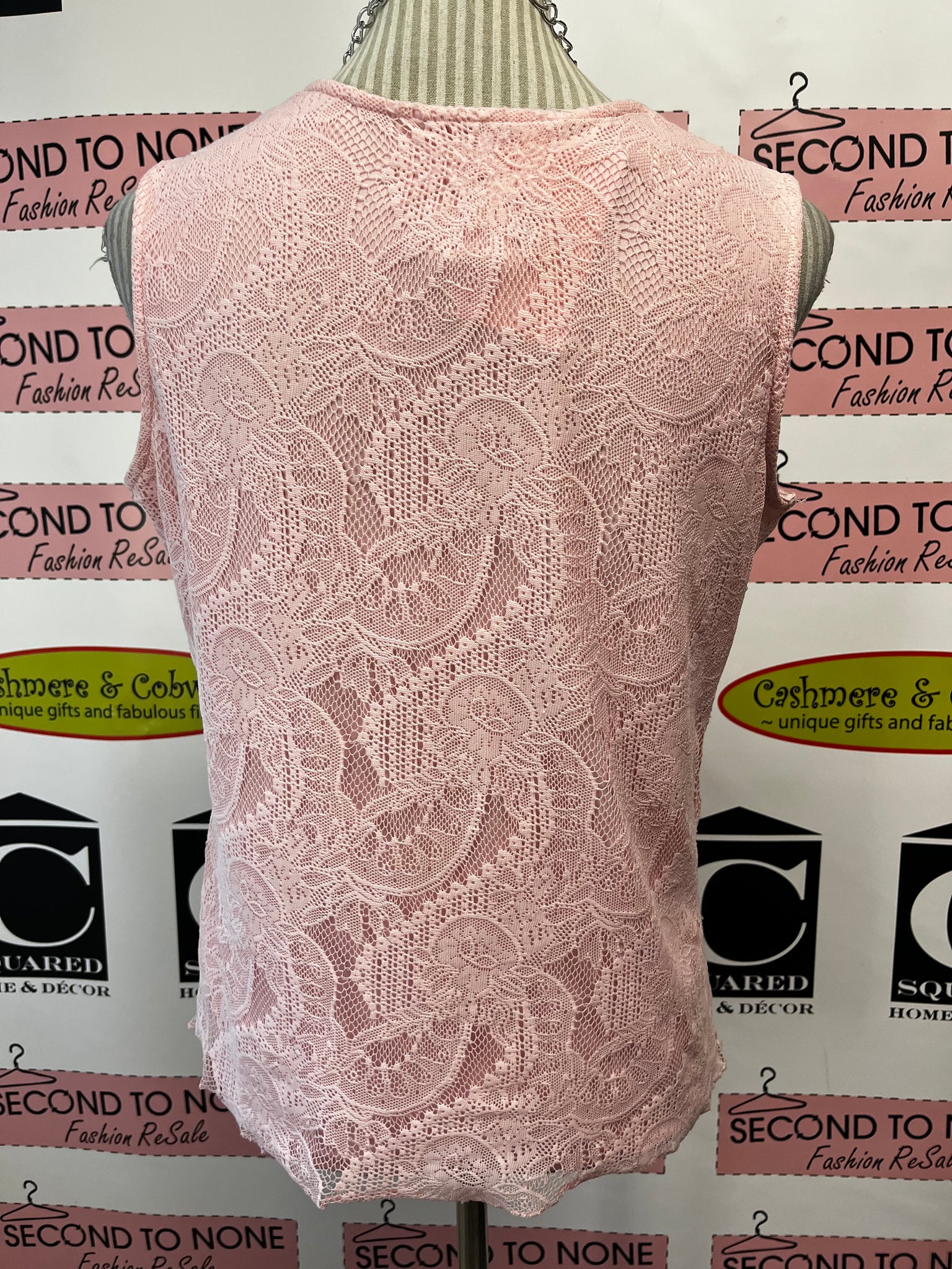 This lacy tiered tank in a soft pink hue is perfect for a playful and flirty look. The all lace design and tiered layers add a touch of whimsy to the comfortable and versatile rounded neckline. Available in size S.