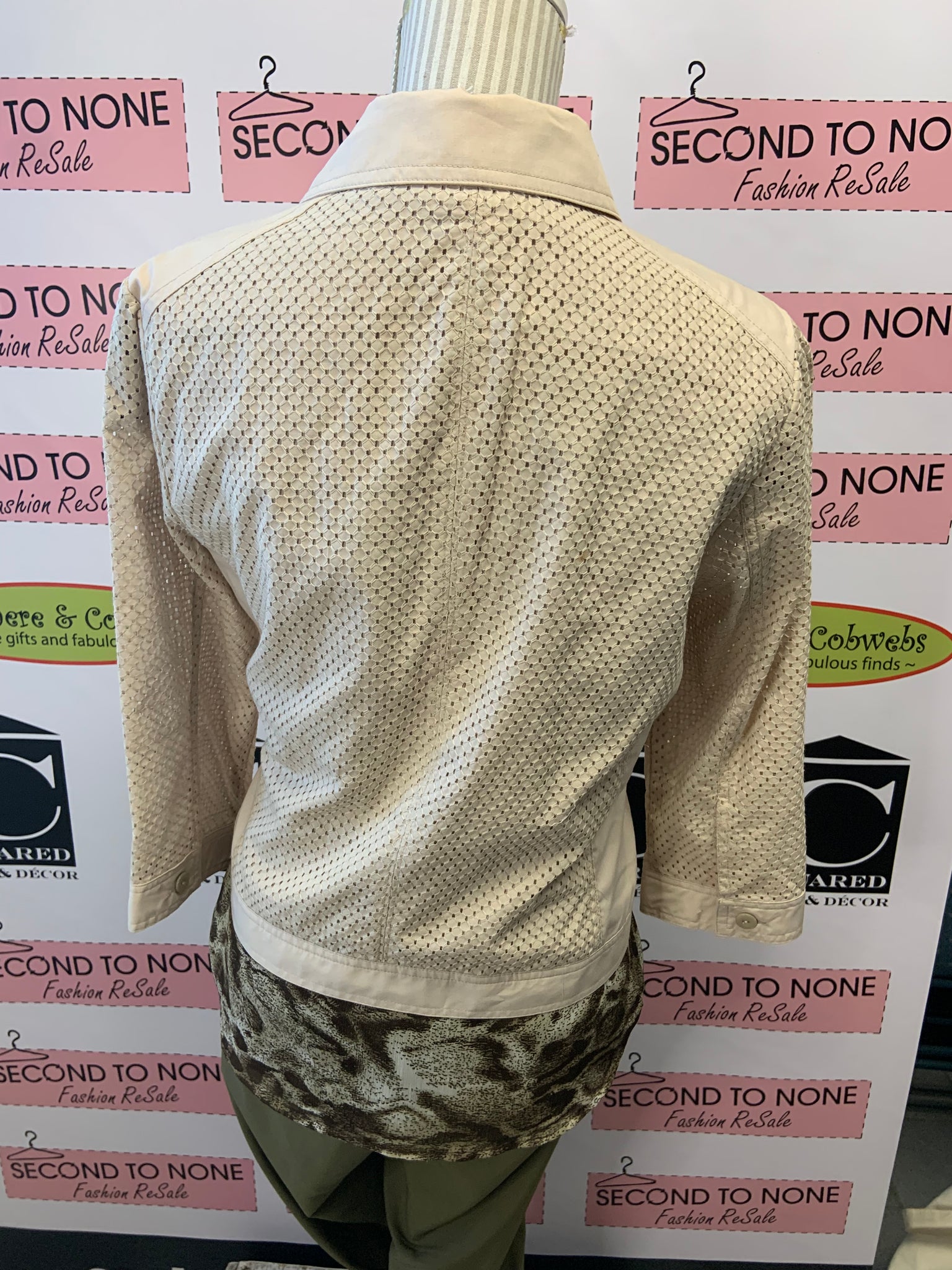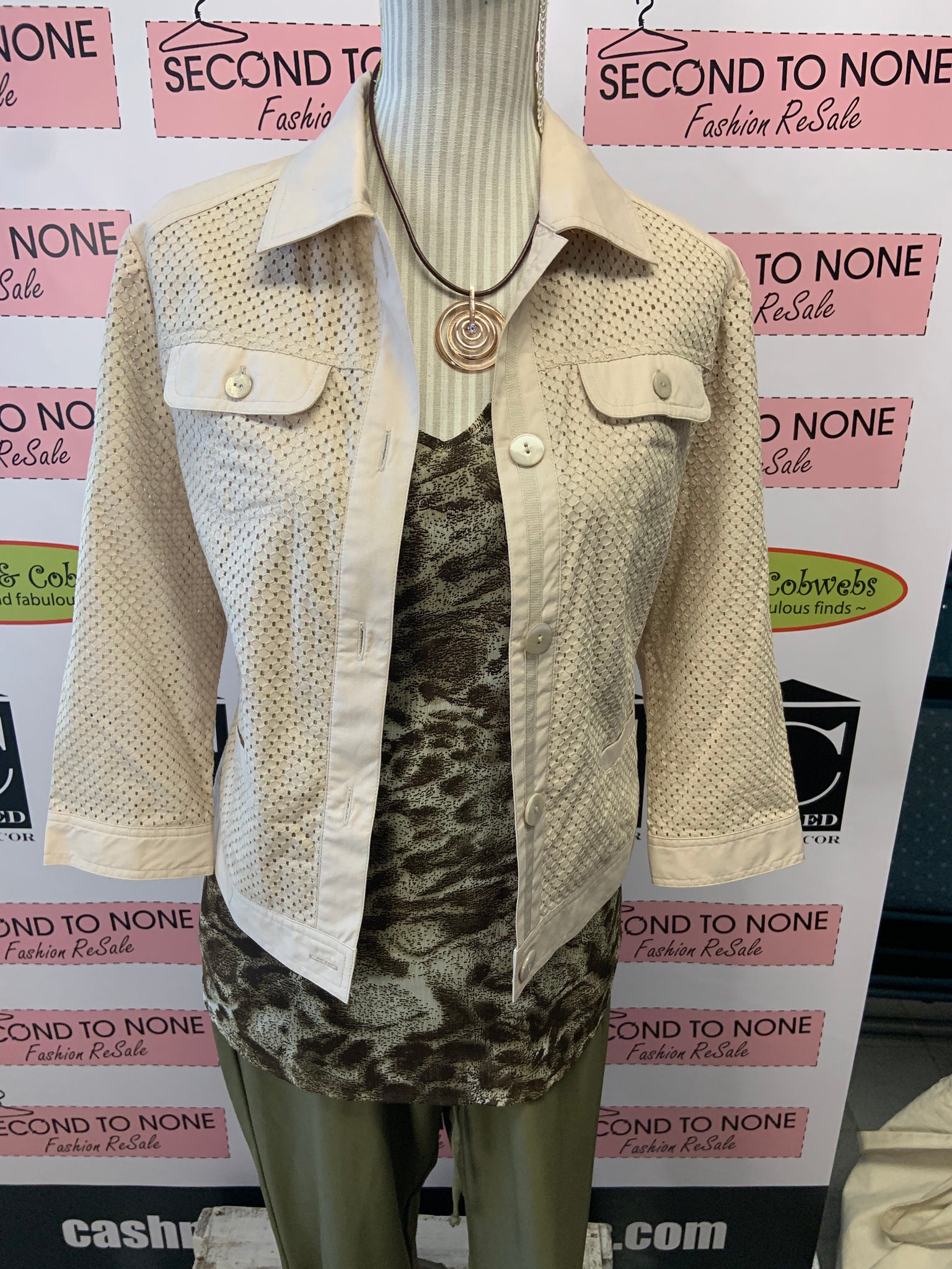 Alia Petites beige coloured jacket with lattice like cut outs gives a unique textured look. Open sleeves and button down front, go from casual to a bit dressed up with a simple change of pants! 55% cotton/45% polyester