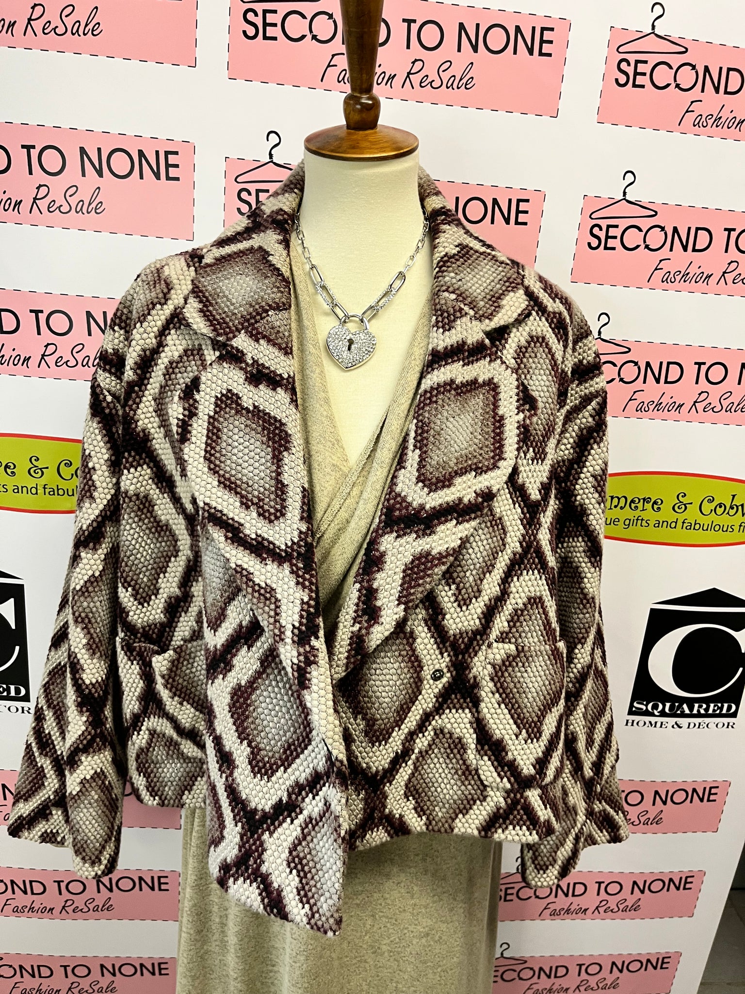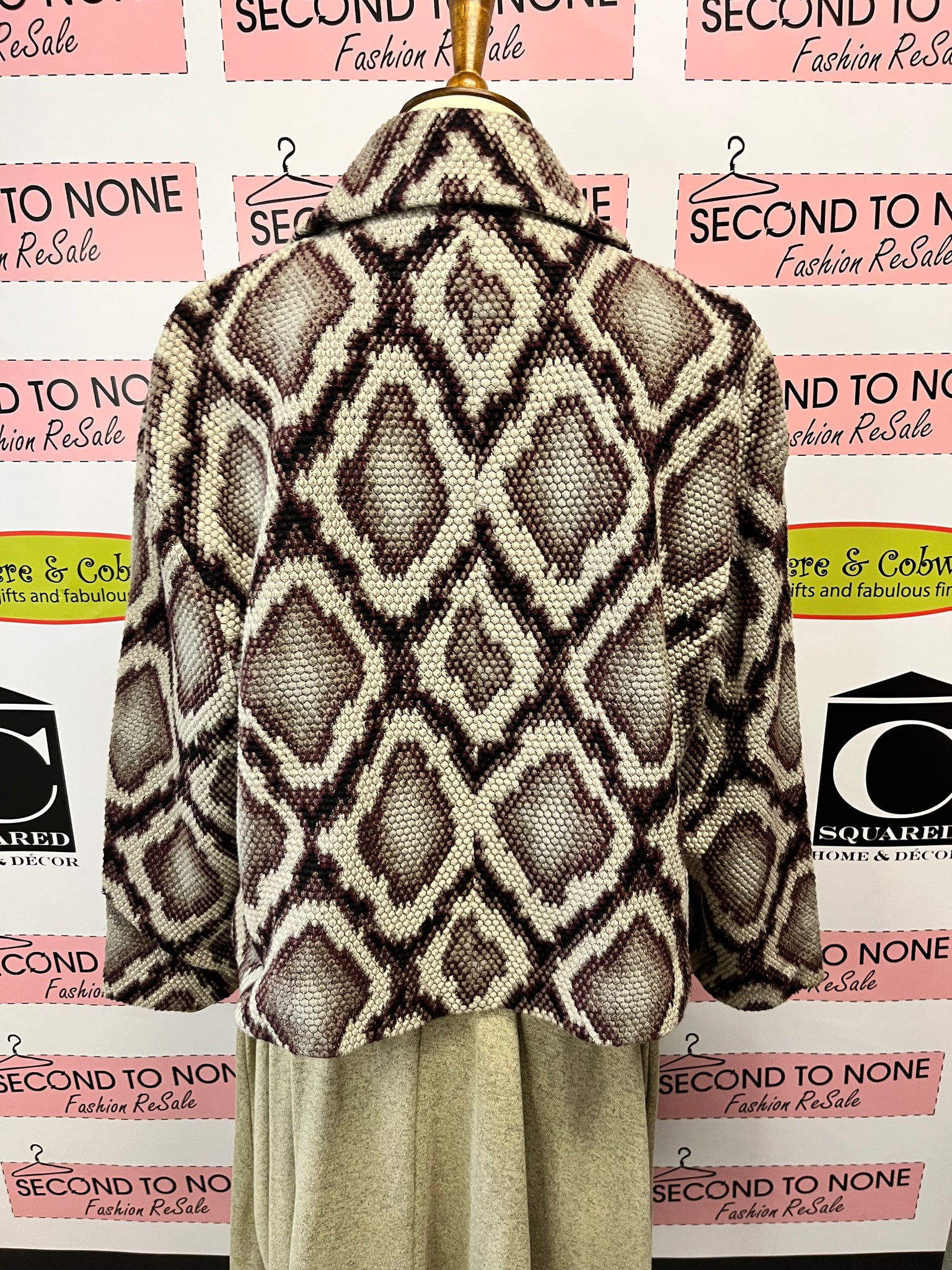 Indulge in luxury with our sophisticated, diamond-pattern jacket. Its dramatic cropped design and textured knit fabric make a statement in oatmeal, deep burgundy, and browns. Featuring a double-breasted style and fully-lined for added elegance, this jacket also boasts 2 front pockets for practicality. Pink Tartan brand. 75% cotton/25% nylon.