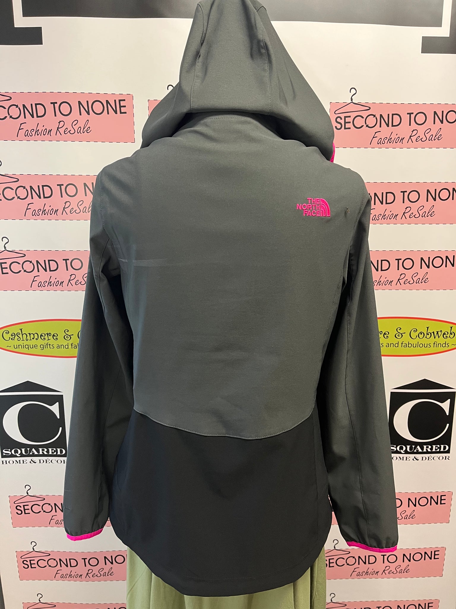 Stay cozy and stylish with The North Face Hooded Softshell Jacket in grey and black, featuring playful pink accents. Its zip-up front and hood offer easy layering and extra warmth, while the softshell fabric keeps you comfortable and protected during your adventures. Perfect for adding a pop of fun to any outfit!