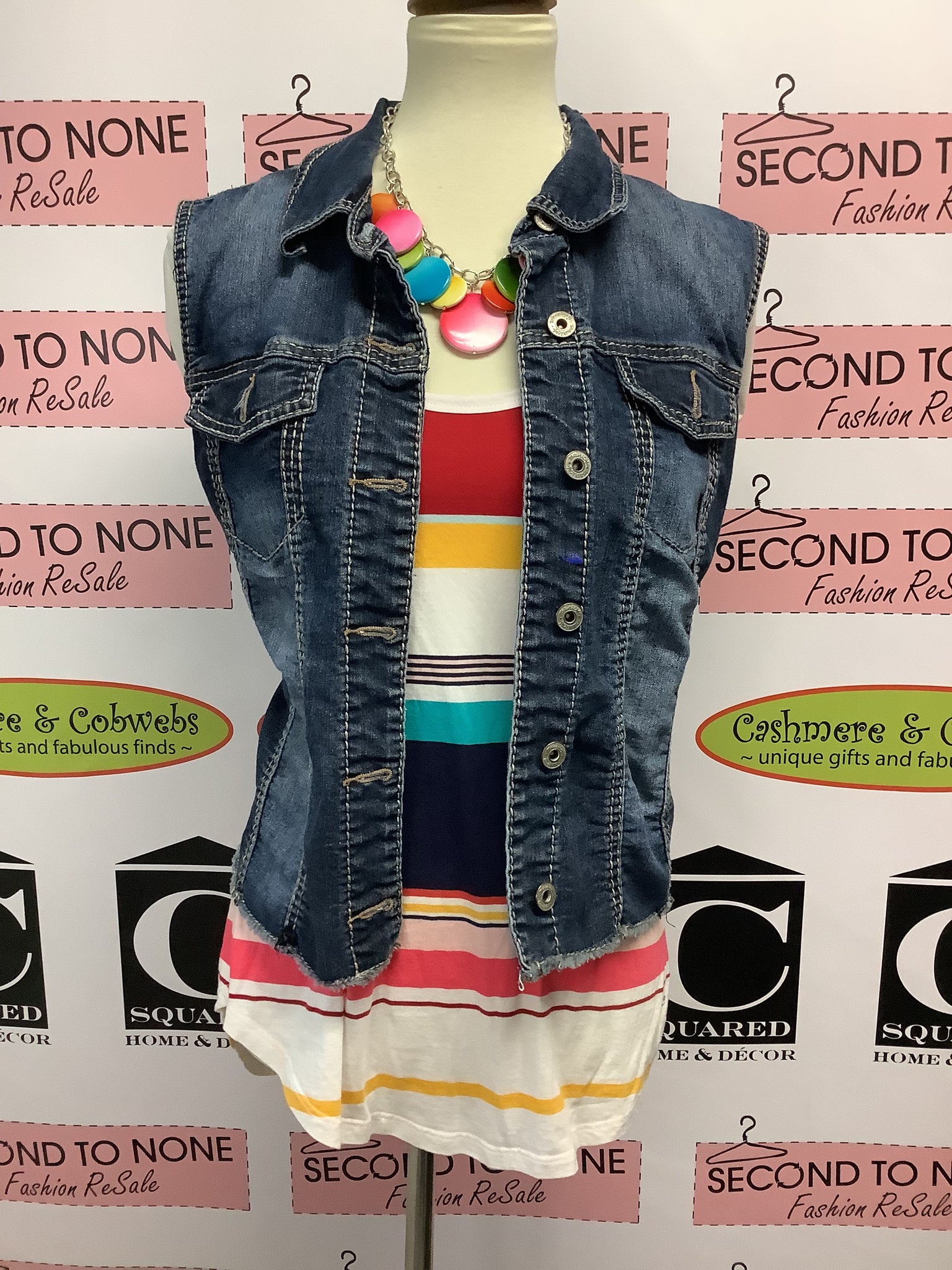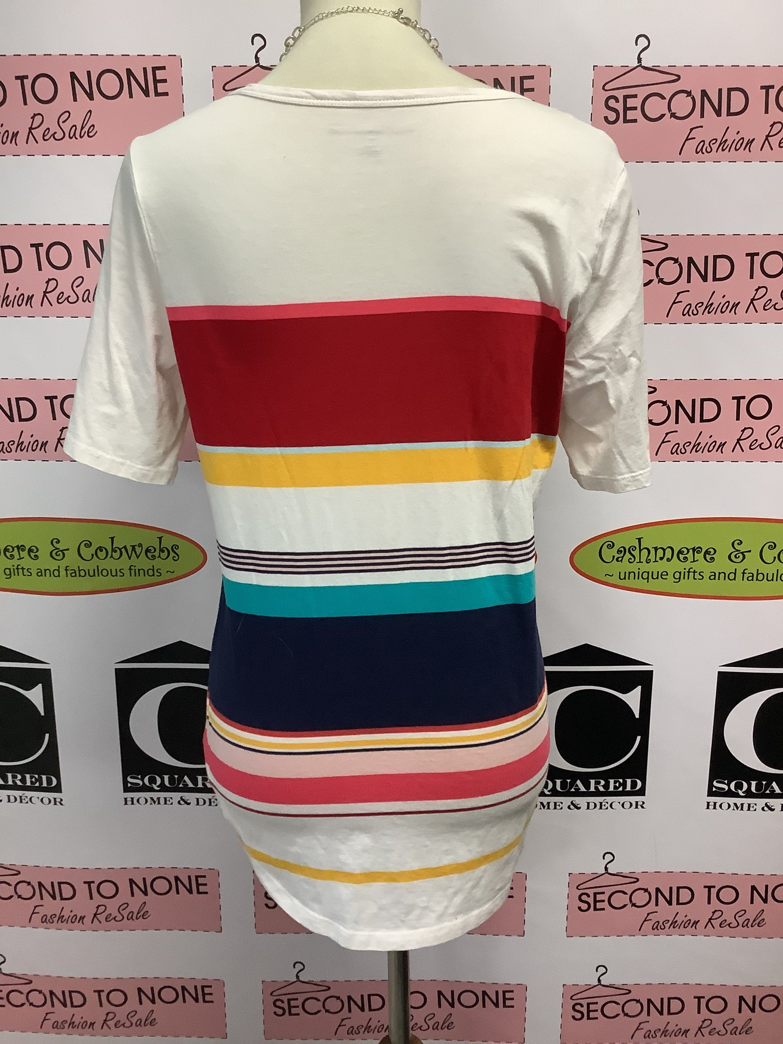 This Tommy Hilfiger Striped Tee in size L is a perfect addition to your wardrobe. With a white base and eye-catching red, yellow, teal, and blue stripes, it's a fashionable and bold choice. The simple scoop neck and short sleeves make it a versatile piece that can be layered with a denim vest or jacket for a cute nautical look. Expertly designed, this tee is both stylish and comfortable.
