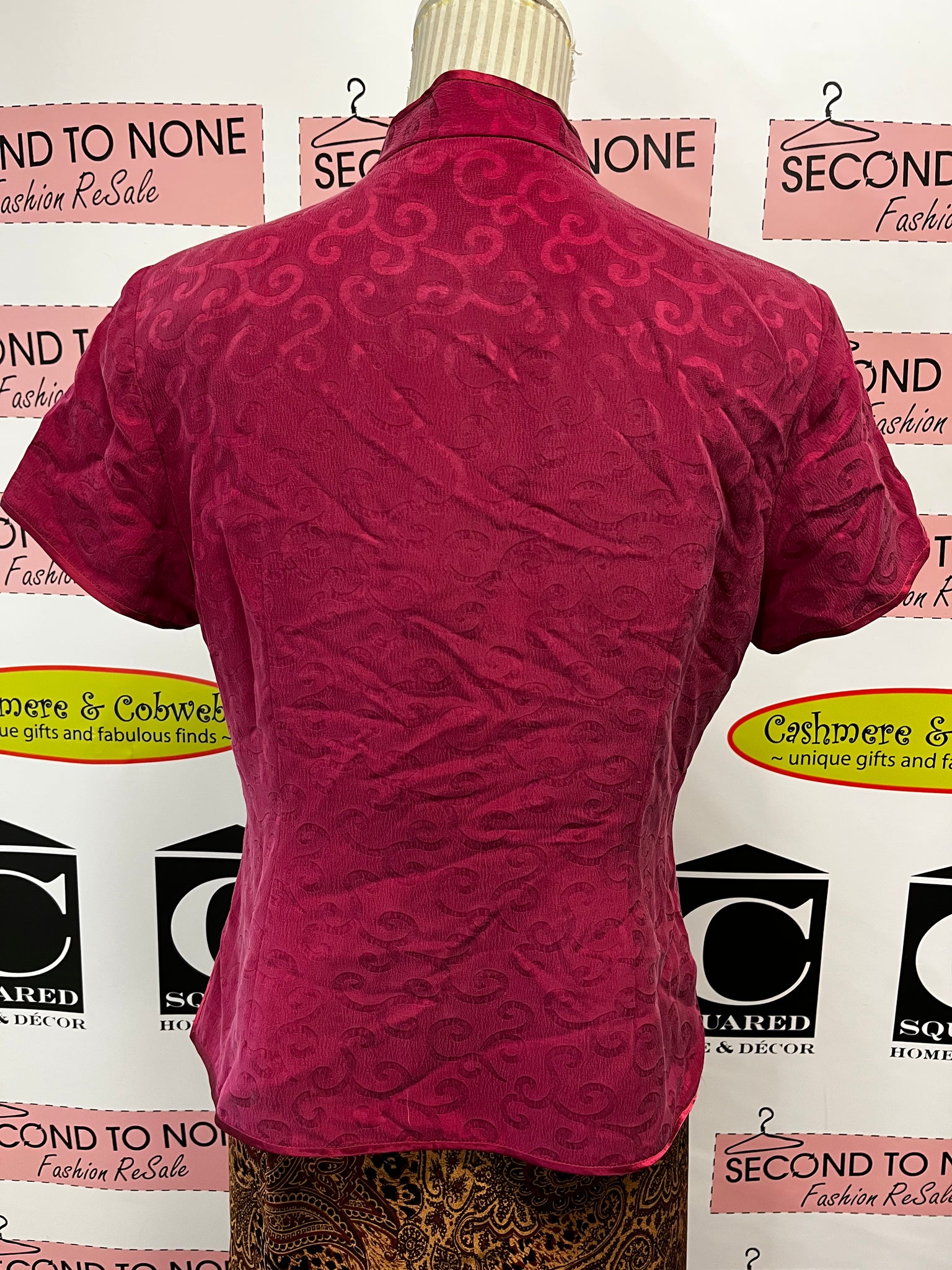 Elevate your wardrobe with this exquisite red wine silk top by Yue Hwa. Featuring a refined mandarin collar and elegant Chinese knot button front, this short-sleeved piece combines timeless tradition with luxurious comfort. Crafted from 100% silk in size XL, it embodies sophisticated style for any occasion.
