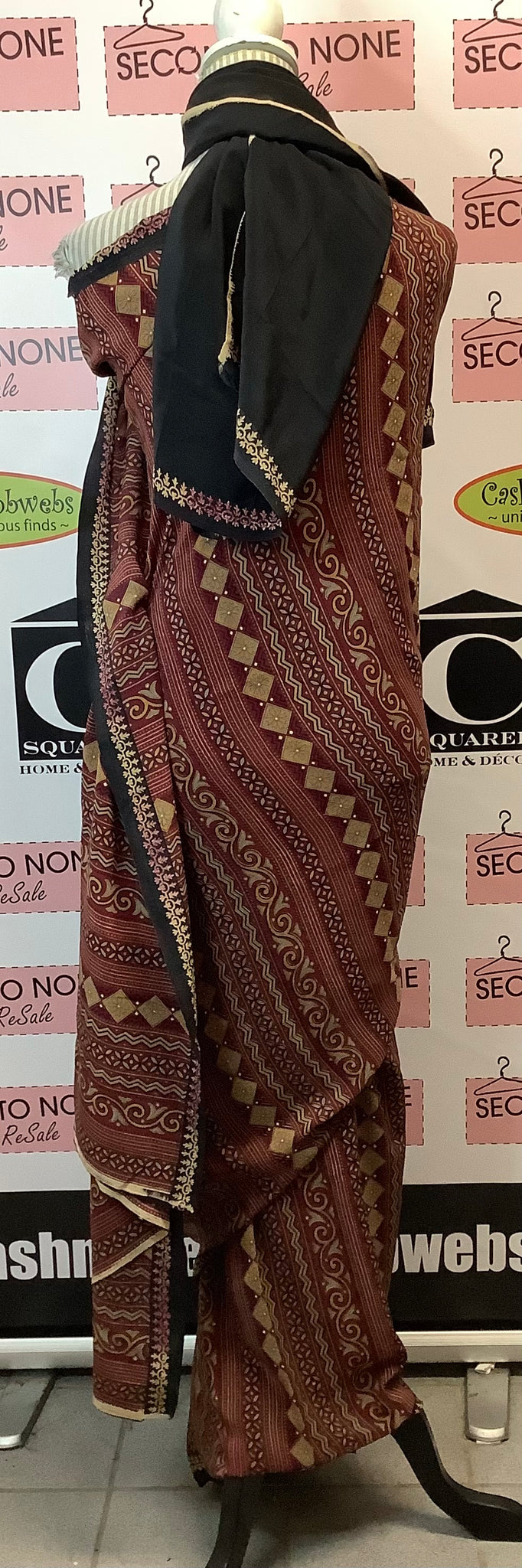Expertly crafted and traditional, this Indian saree is a must-have in any wardrobe. The bold burgundy, black, and taupe pattern adds an elegant touch to this one-size-fits-all piece. Plus, with the additional scarf piece, you can create even more stunning looks. Made with ultra soft fabric for ultimate comfort.
