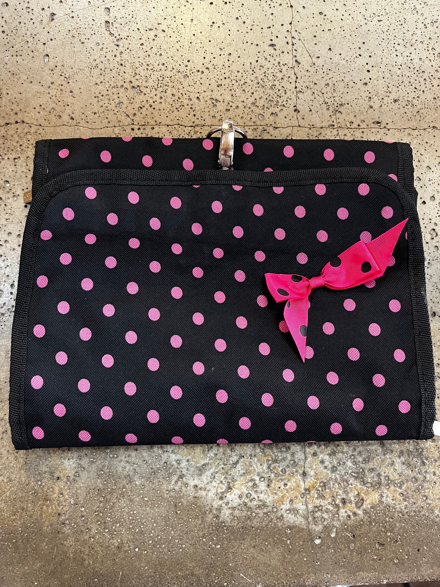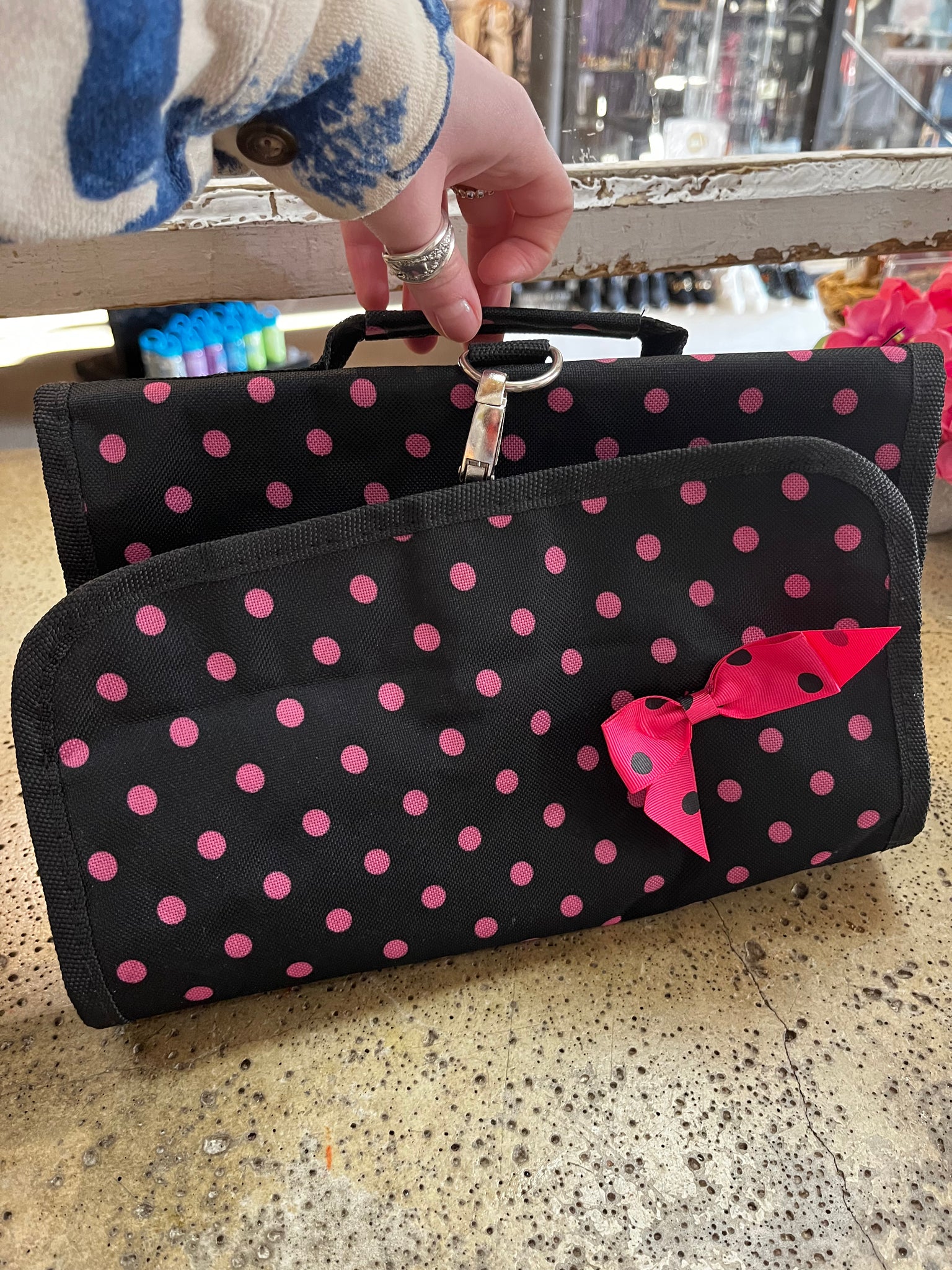 Make traveling a breeze with our Travel Toiletry/Makeup Bag! Featuring a chic black design with playful pink polka dots, it conveniently folds up for easy packing. This versatile bag is perfect for storing all your toiletries and makeup essentials on the go. Created by LULA, the perfect travel companion!